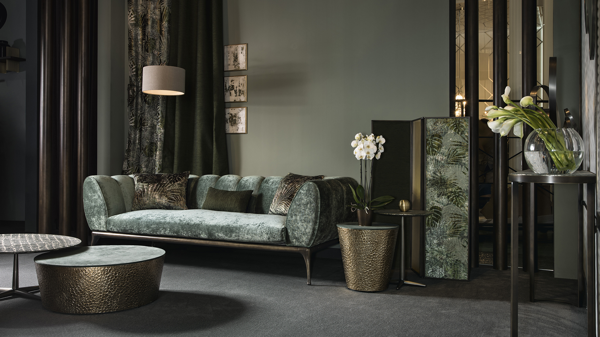 La strutta perimetrale è realizzata in alluminio con i piedi in pressofusione. Il molleggio è garantito da cinghie elastiche su telaio in acciaio. La struttura dello schienale e dei braccioli è realizzata in legno multistrato rivestito in poliuretano espanso a quote differenziate ad alta densità e lo strato superiore ad alta componente elastica che, aggregato allo strato inferiore, garantisce una migliore morbidezza nel tempo. La seduta in legno, imbottita in gomma a densità variabile, ad alta resilienza, è rivestita sartorialmente, con trapuntatura verticale, in tessuto, velluto, pelle, ecopelle o con tessuto/pelle fornito dal cliente. Un divano dalle linee morbide e senza tempo per arredare con stile il proprio living rendendolo accogliente.