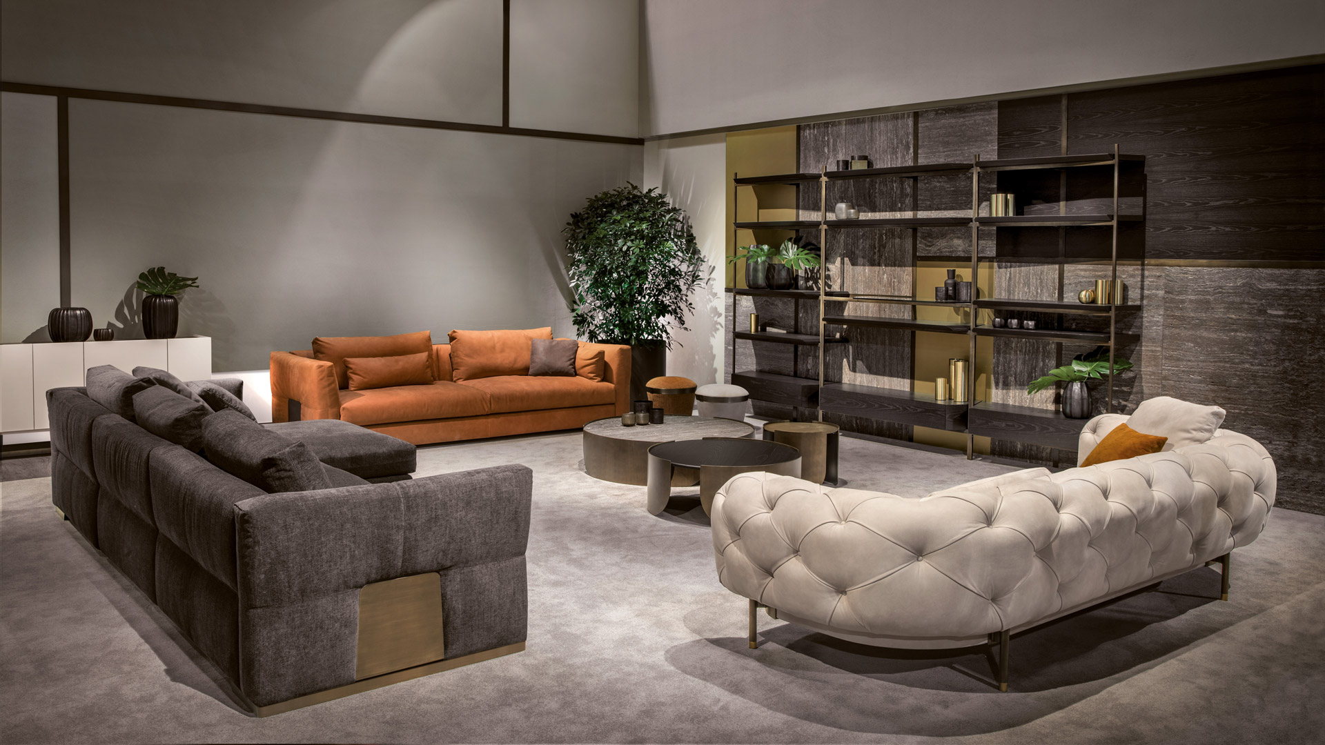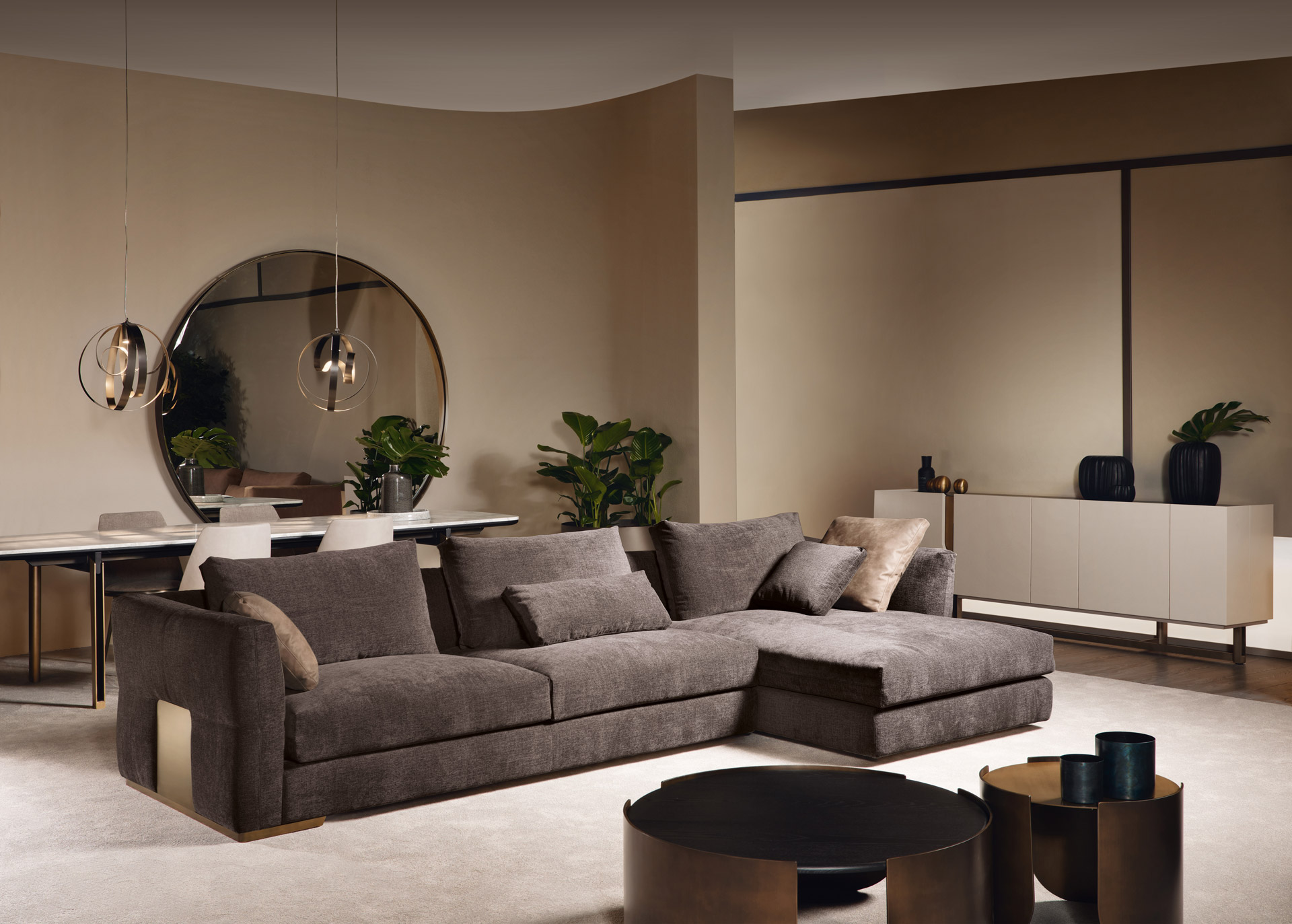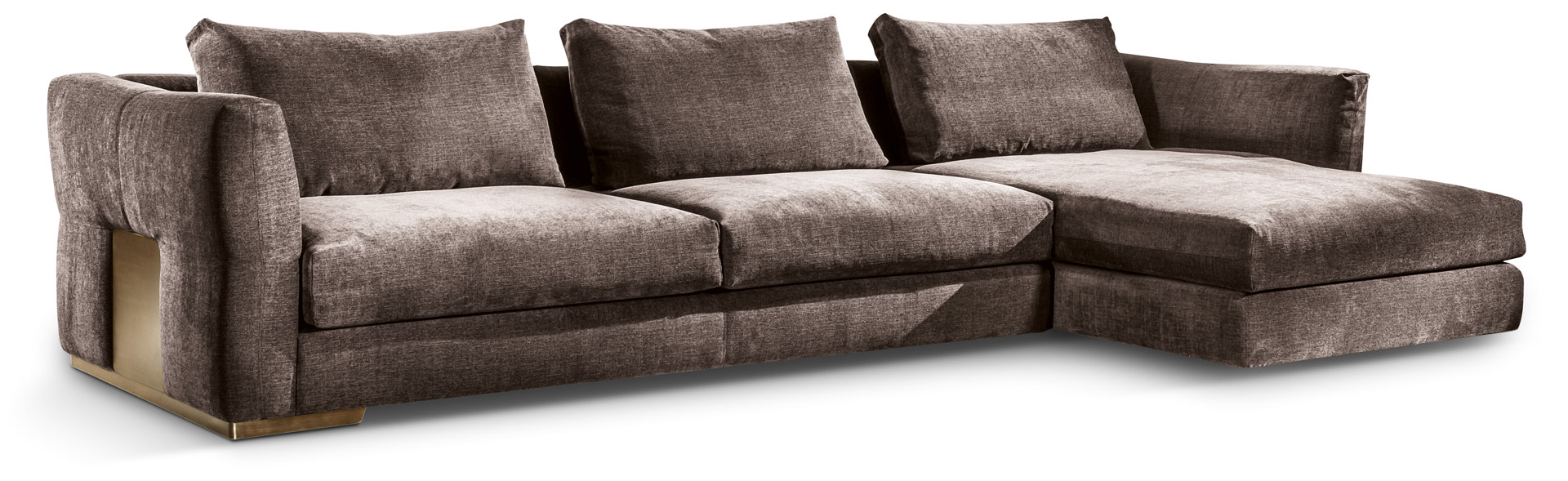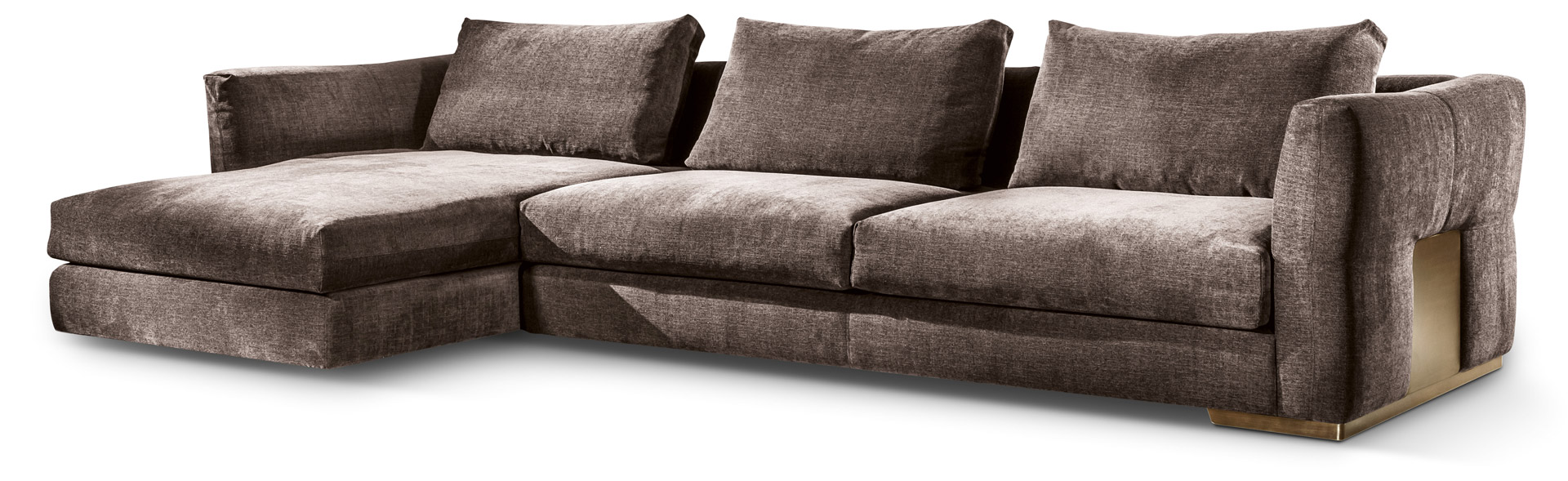 La struttura è in legno massello in faggio e pioppo con inserti in multistrato, il molleggio è garantito da cinghia elastiche indeformabili. Il rivestimento strutturale è in poliuretano espanso a quote differenziate ad alta densità e lo strato superiore ad alta componente elastica, la cuscinatura è a densità differenziata indeformabile in piuma e falda sintetica. Una piastra in metallo bronzato, tagliata a laser, contiene il divano come in un abbraccio. Progettato per adattarsi sia ad ambienti moderni che classici, con il suo design e la sua sensazione immediata di comodità si farà ammirare in tutte le sue angolazioni.