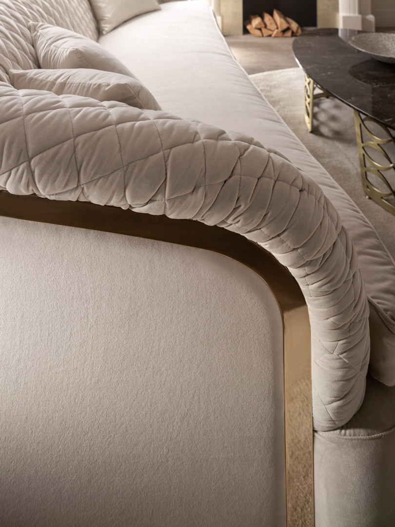 La struttura è in massello di faggio, con molleggio garantito da cinghie elastiche ad alta componente di caucciù. Il rivestimento strutturale è in poliuretano espanso a quote differenziate ad alta densità e lo strato superiore ad alta componente elastica che, aggregato allo strato inferiore, garantisce una migliore morbidezza nel tempo. L’interno della spalliera è rivestito da una soffice trapunta, mentre la parte esterna è impreziosita da una fascia metallica che corre su tutto il perimetro dello schienale. Il cuscino della seduta è sfoderabile e realizzato in gomma a densità variabile ad alta resilienza rivestita con morbida piuma d’oca canalizzata. L’ergonomia dello schienale e della seduta insieme alle imbottiture, sostenute ma accoglienti, offrono un comfort elevato. Un divano che propone tutta la sua valenza formale nella scenografia del living, da ammirare da ogni angolazione.