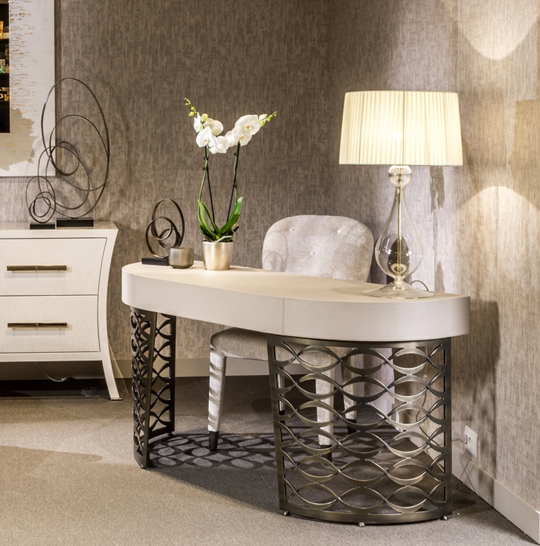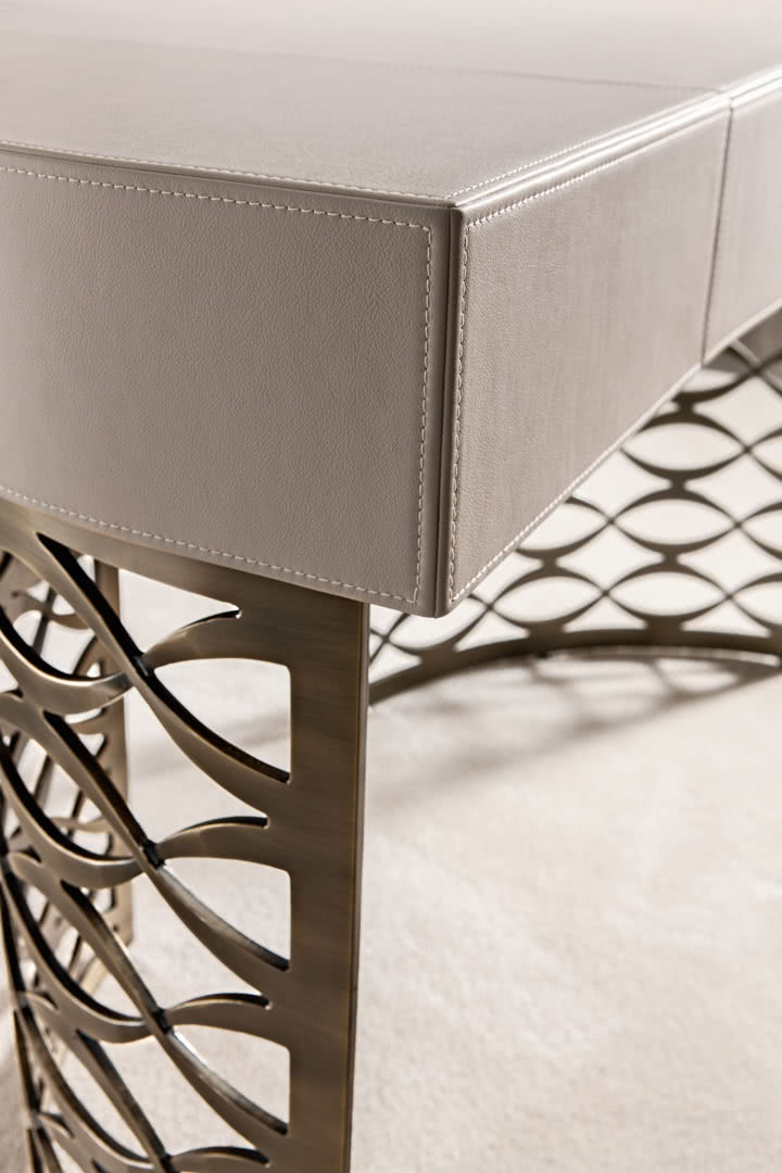 La base in ferro pieno è tagliato a laser, fresato e curvato a formare un disegno tridimensionale dal forte impatto visivo; disponibile nelle finiture dorate e bronzate o in foglia. Il piano in legno è sagomato e rivestito in pelle, contiene un cassetto estraibile a scomparsa. La scrivania Isidoro è disponibile in due diverse misure; ideale per la camera o un ufficio privato grazie al gusto internazionale.