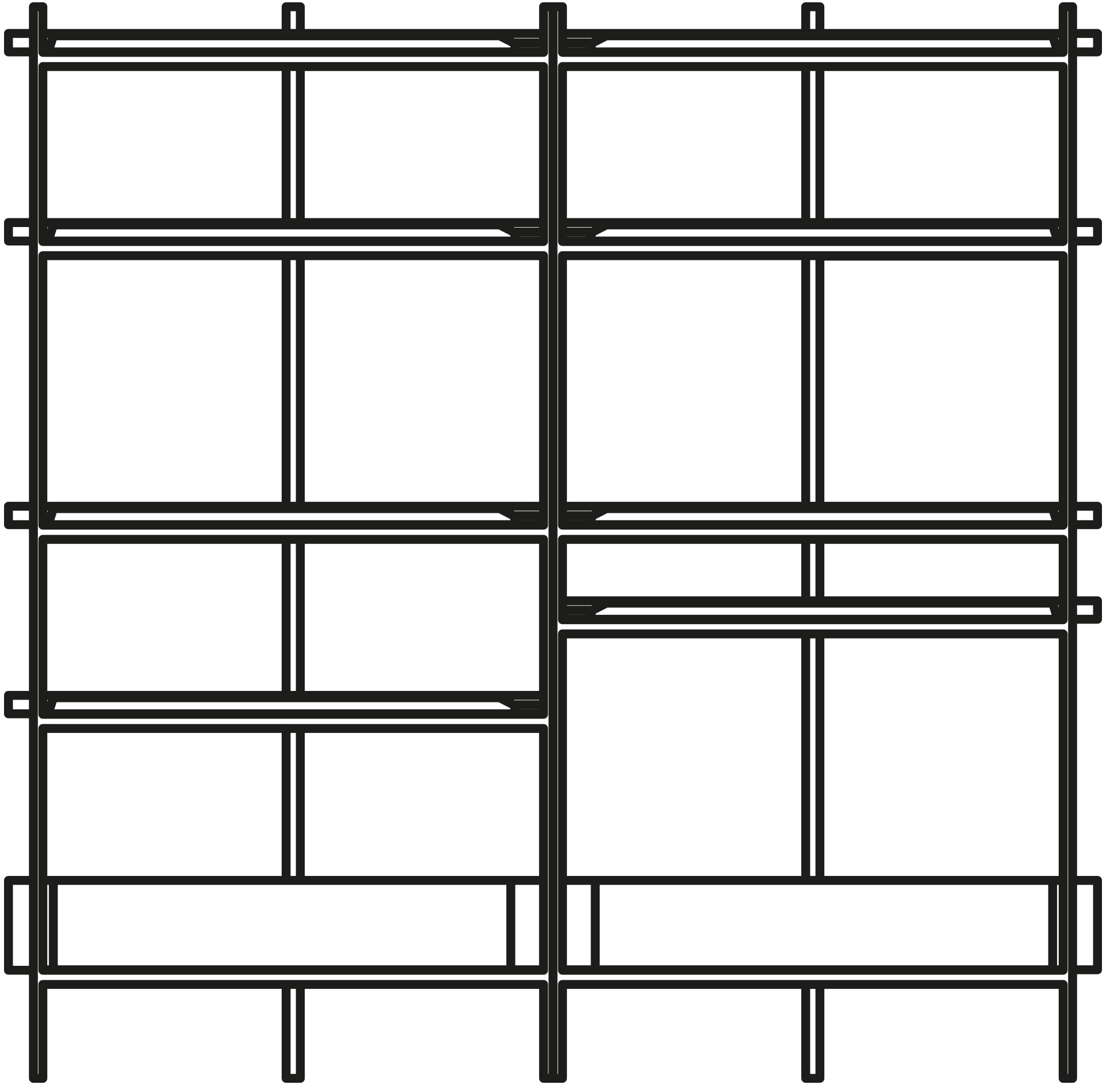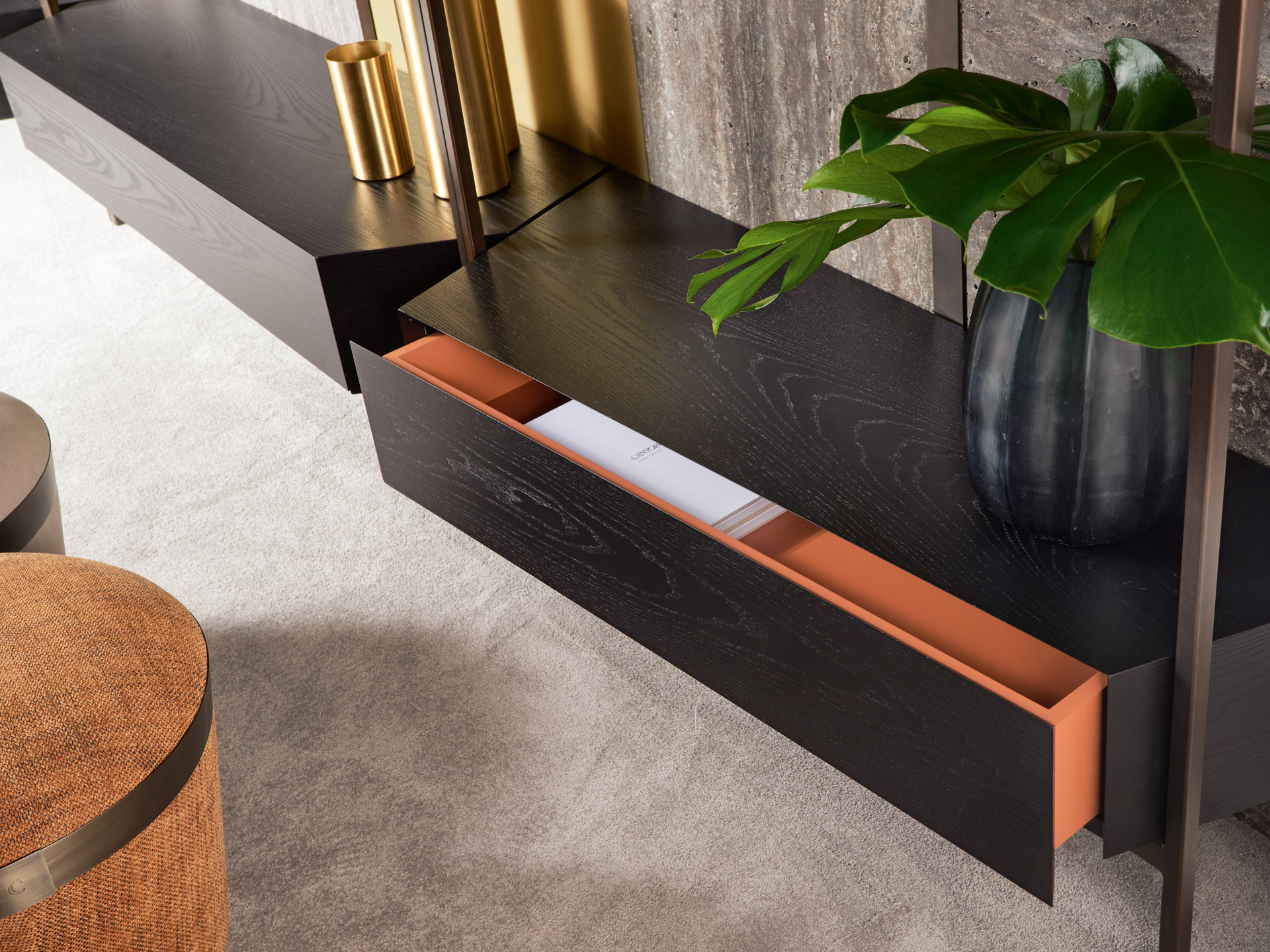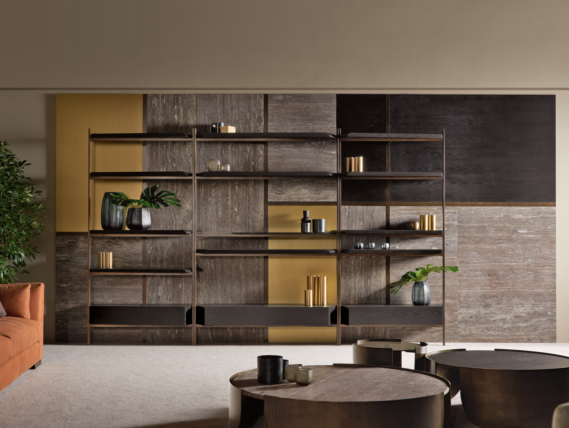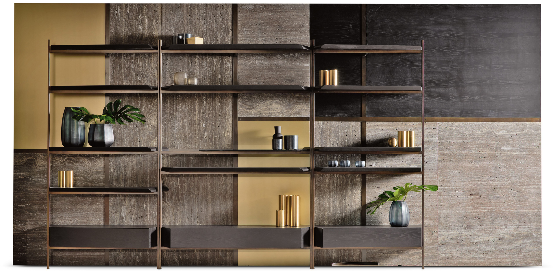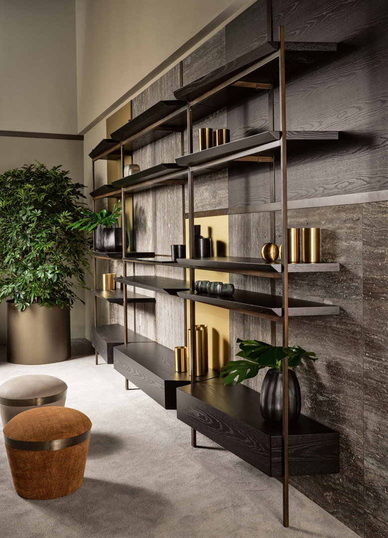 La struttura portante è in metallo di sezione quadrata con rifinitura bronzo patinato. I ripiani possono essere in legno di frassino nero e noce nazionale, in vetro e in marmo con cassetti a estrazione totale. Le mensole si incastrano l’una con l’altra creando giochi di geometrie e di luci riflesse da materiali diversi e preziosi. Con la sua struttura lineare e componibile, è perfetta anche come parete divisoria all’interno di un open space.