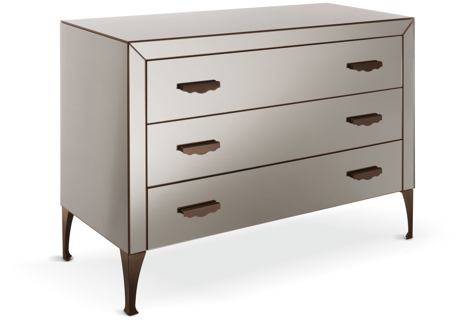 Presenta 3 cassetti con guide ad estrazione totale e richiamo frenato. Tutto rivestito in specchio molato con maniglie e piedi in metallo o in bronzo. Un comò dal sapore vintage che, insieme ai comodini, crea un gruppo notte perfetto anche per una camera da letto classica o vintage.