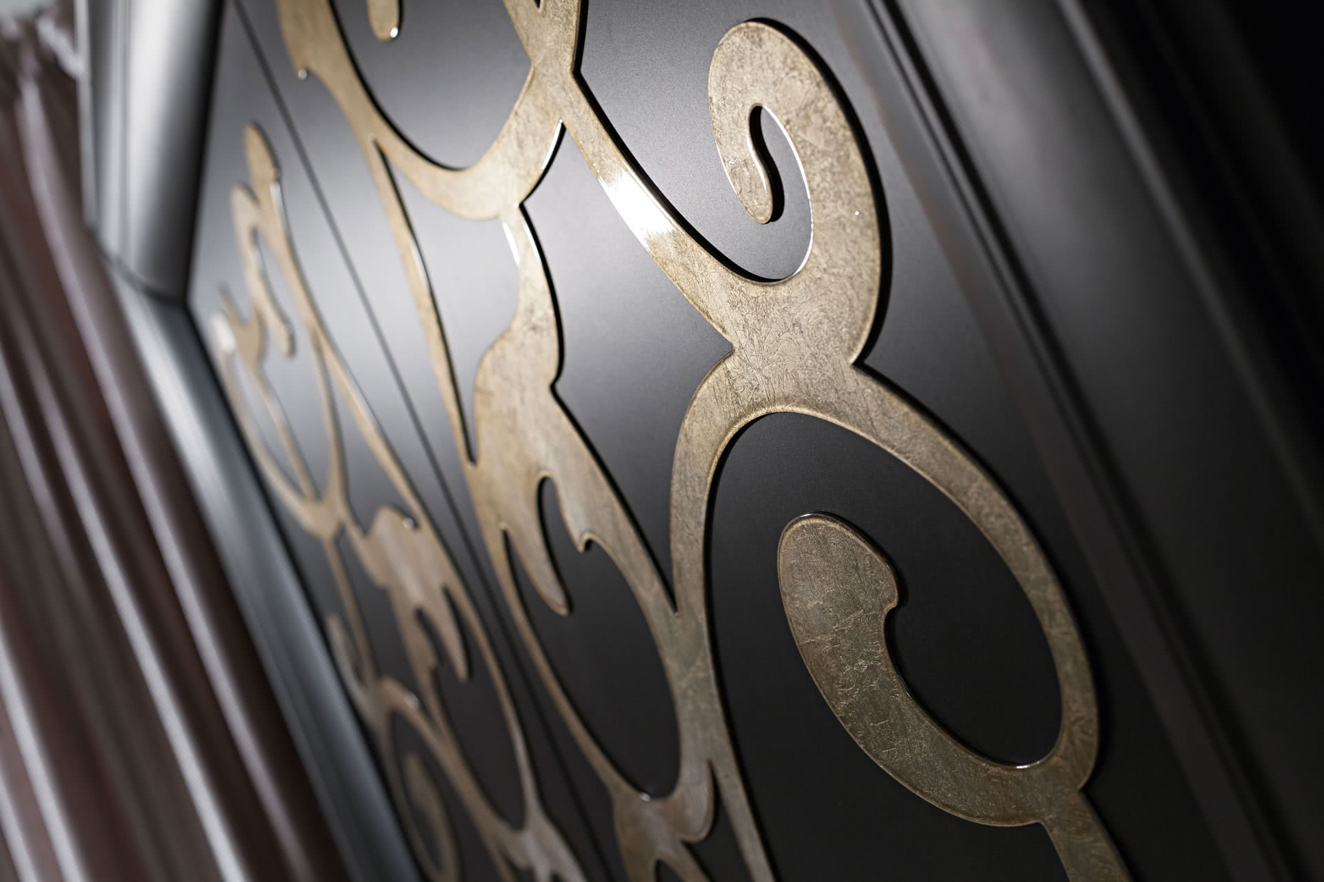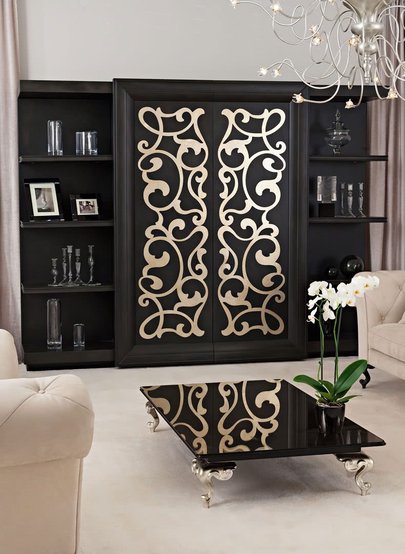 I ripiani esterni e interni sono in legno con profili sagomati. Le ante centrali, decorate artigianalmente, hanno cornici perimetrali in massello sagomato e possono scorrere simultaneamente su binari. L'elemento decorativo è realizzato invece in lamiera di acciaio tagliata a laser e decorata a mano. Possibilità di inserire l’azionamento automatico “touch e telecomando”.