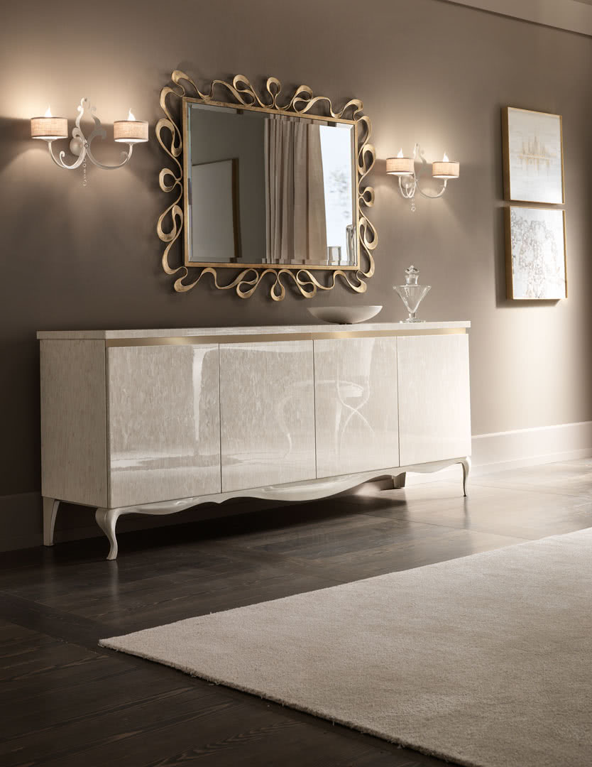 Internamente è divisa con quattro vani, ognuno con un ripiano. La struttura in legno è completamente decorata a mano mentre la base è in ferro, tagliata a laser e saldata a filo, levigata e bombata a freddo. La fascia in oro che divide il top dalle ante mette in evidenza la finitura decorata a mano.