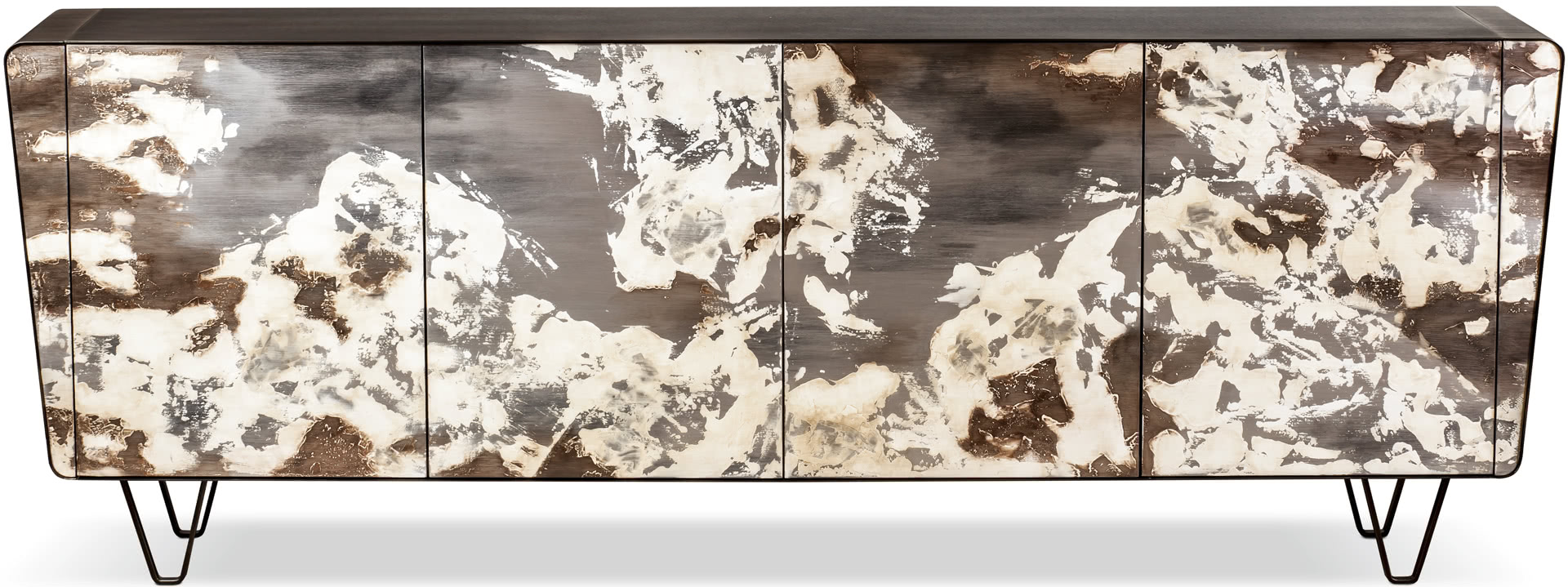 Feet and handles made with shaped steel rod, crystal glass top. The matt lacquered interior can be customized in the colours, while there are three available decorations for the front: "wisteria", "vintage" gold leaf, "storm". The vintage gold leaf decoration is created by hand, applying one entire piece of gold leaf on a dark bronze coat. Although it may seem randomly applied, the decoration is in truth very accurate; the gold leaf is a thin layer laid very gently and with great aesthetic sensitivity, to give the right light between one layer and the other. In the “wisteria” decoration liquid chalk is carefully poured on the light coat. Next step: wisteria flowers and branches are painted by hand on the mother-of-pearl base coat, fllowing the pattern previously created. Chalk, acrylic paint and spatula are the elements of the “storm” decoration: combined together they create an impressive three-dimensional effect.