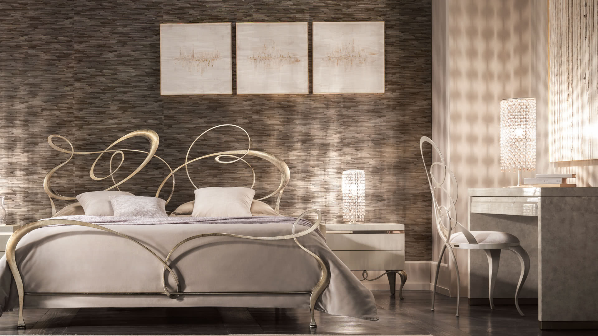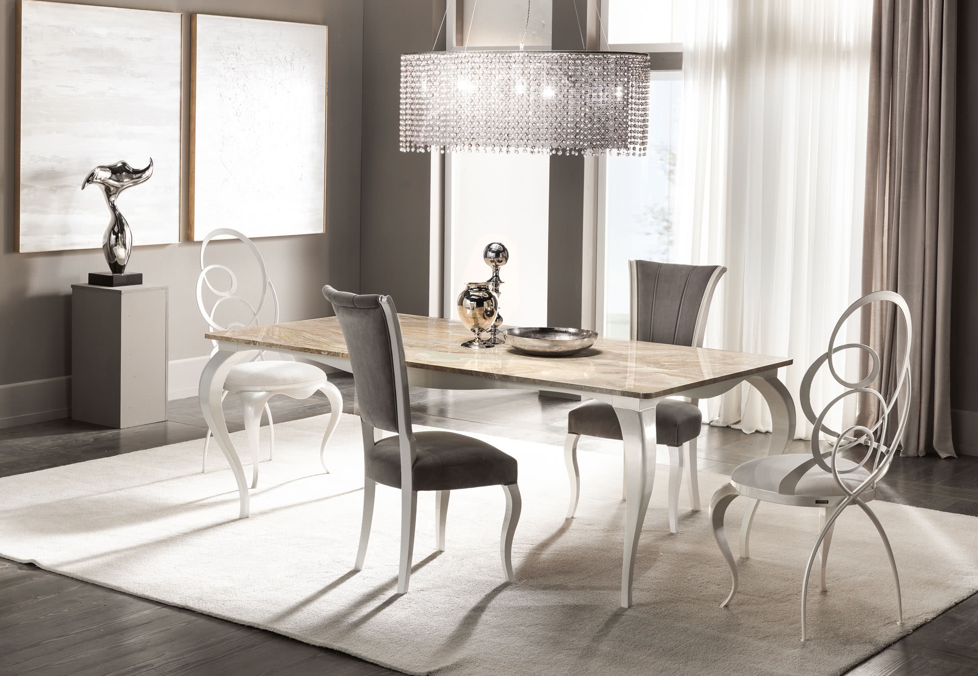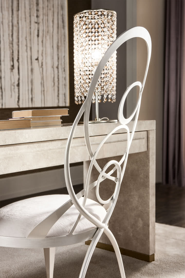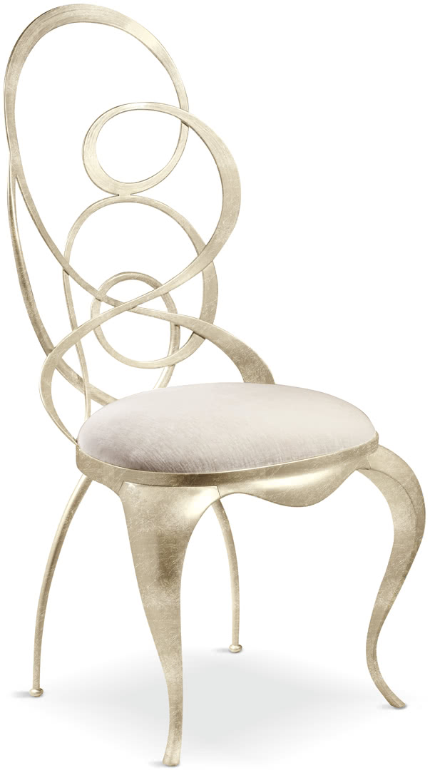 La decorazione asimmetrica, destra o sinistra, della spalliera e delle due gambe posteriori è in ferro trafilato, tagliato a laser e bombato a freddo. Le superfici e le saldature a filo sono interamente levigate a mano. Le gambe anteriori sono realizzate invece in pressofusione di alluminio. La finitura in foglia o in madreperla dell'intera struttura è realizzata a mano. La seduta è in legno imbottito in gomma e rivestito sartorialmente (non sfoderabile).