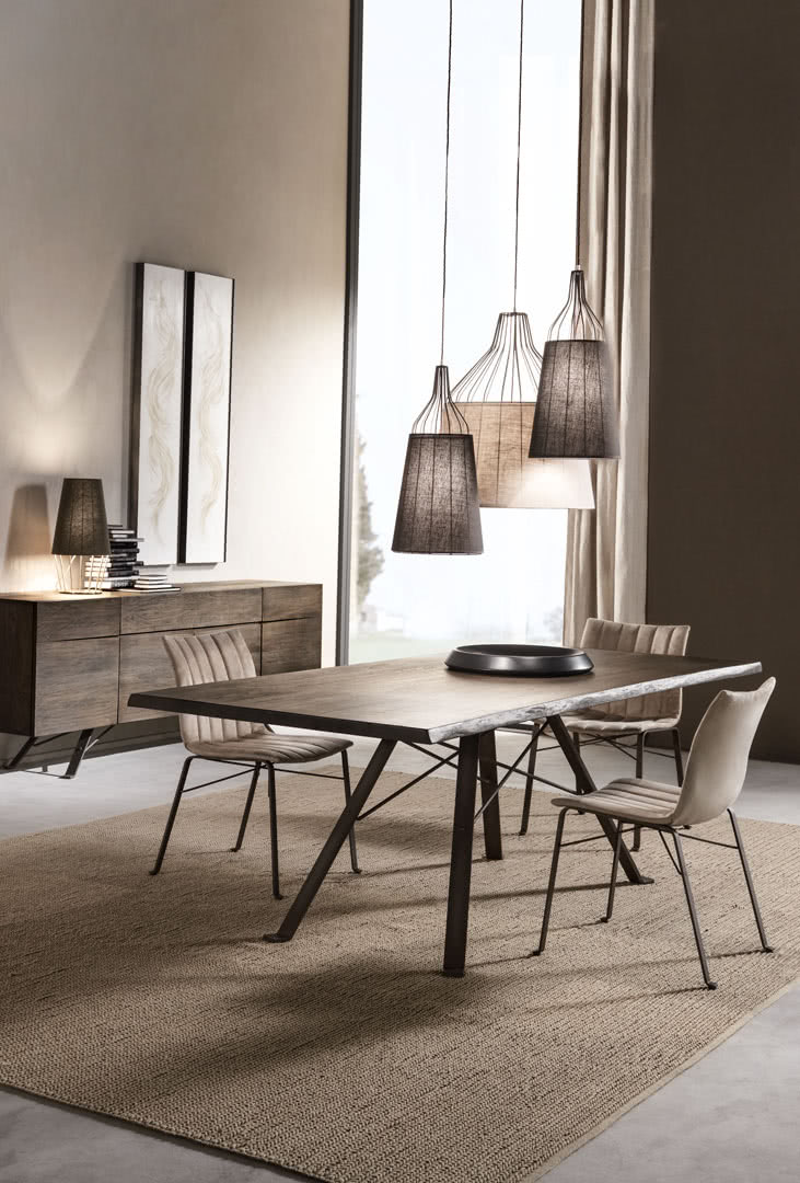La base è realizzata in ferro pieno, curvato e assemblato a traliccio. La seduta ergonomica, con un’anima in legno curvato ergonomica, è imbottita con “memory foam” e lavorata con trapuntatura a losanga per renderla comoda e avvolgente. Design moderno.