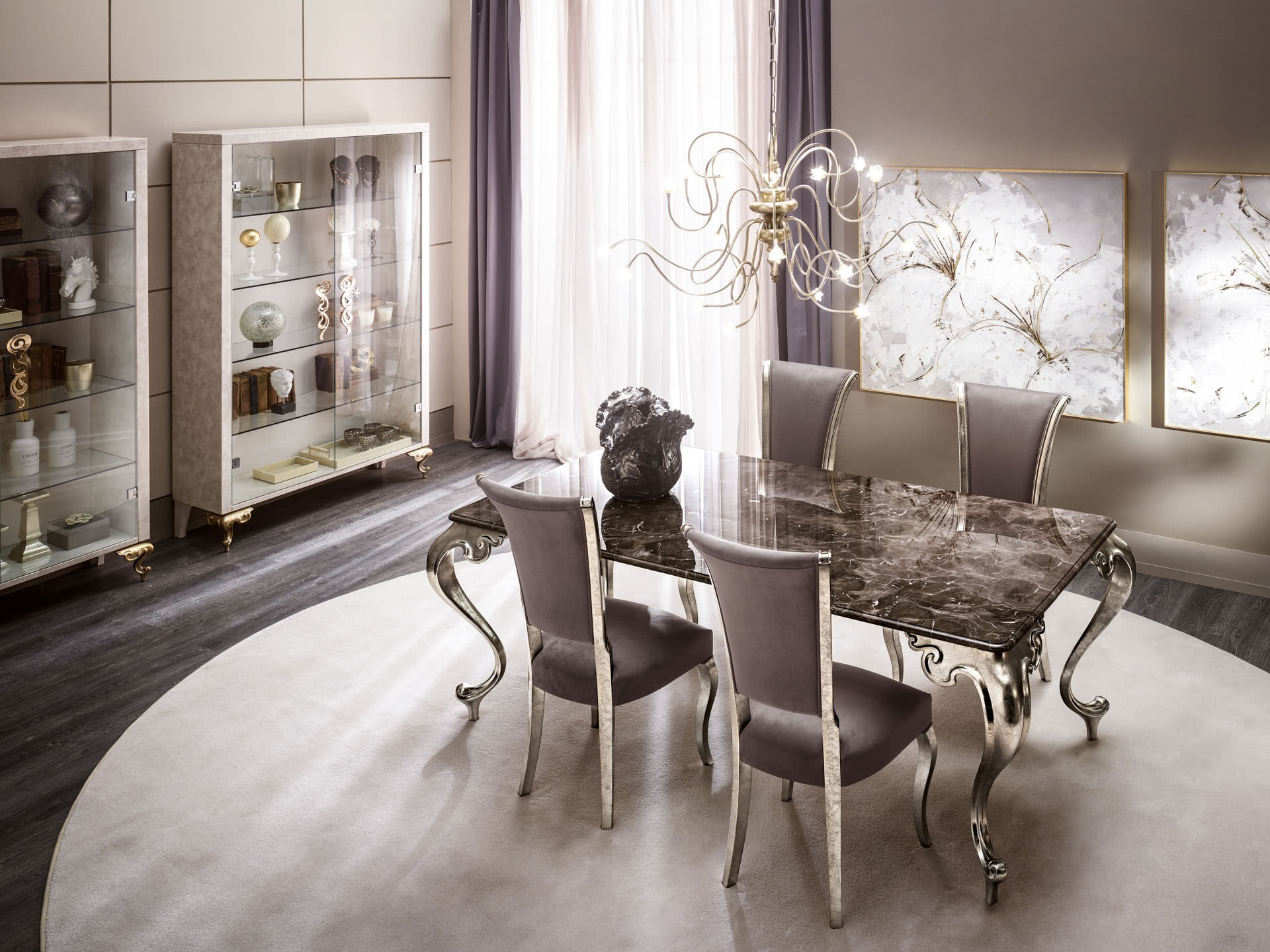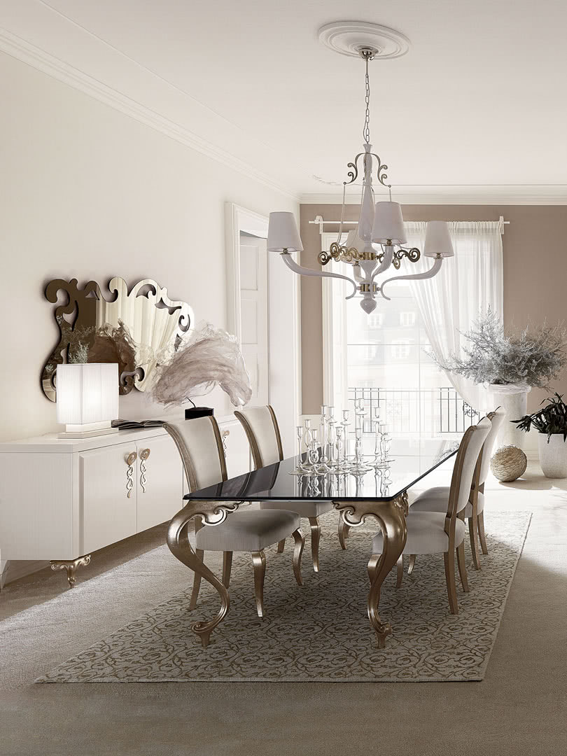 La cornice e le gambe sono in legno massello sagomato e scolpito a mano con finitura in foglia o in madreperla realizzata artigianalmente. La tappezzeria di rivestimento, imbottita, è realizzata a mano in tessuto, velluto, pelle o con un tessuto fornito dal cliente.