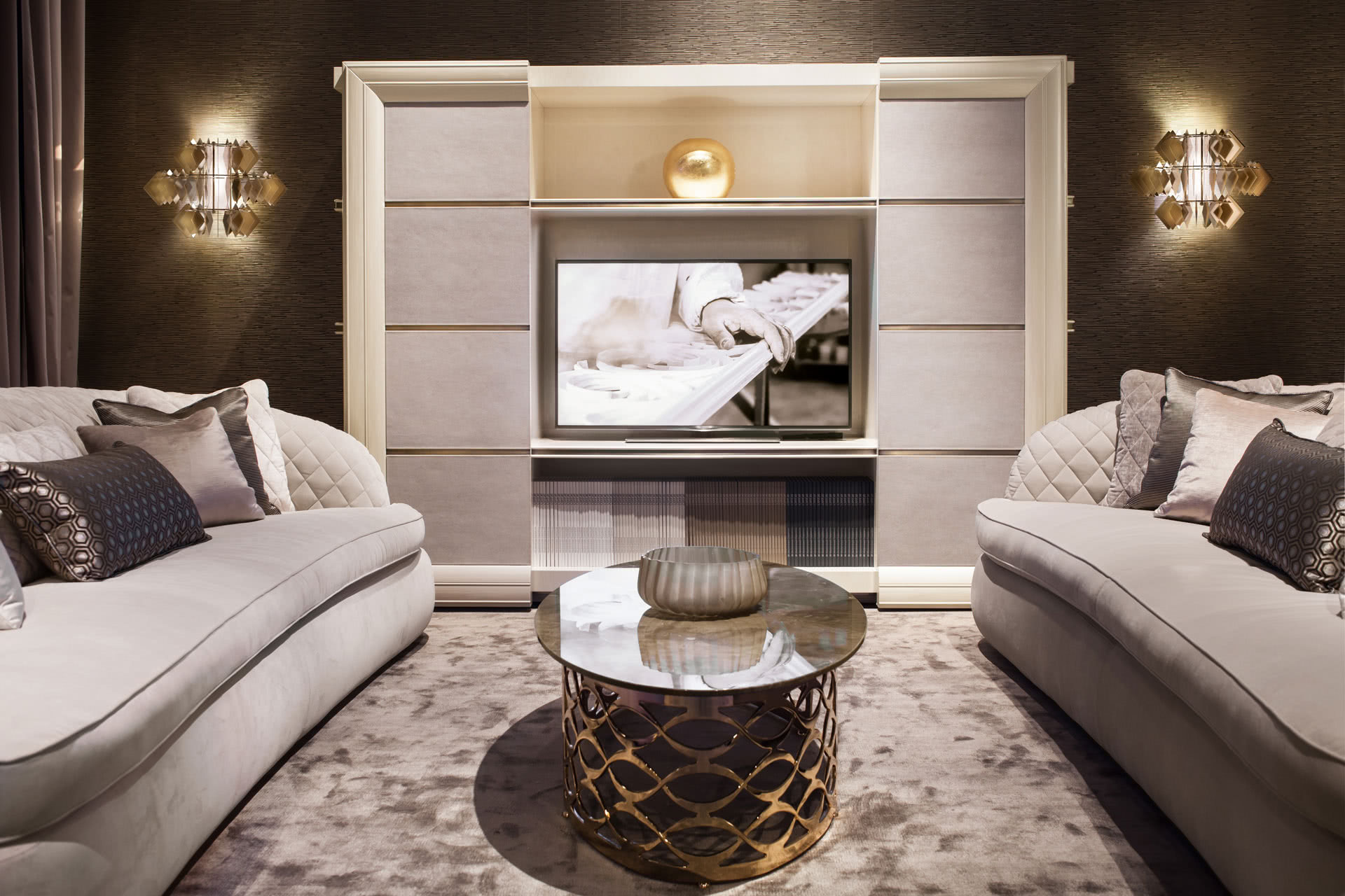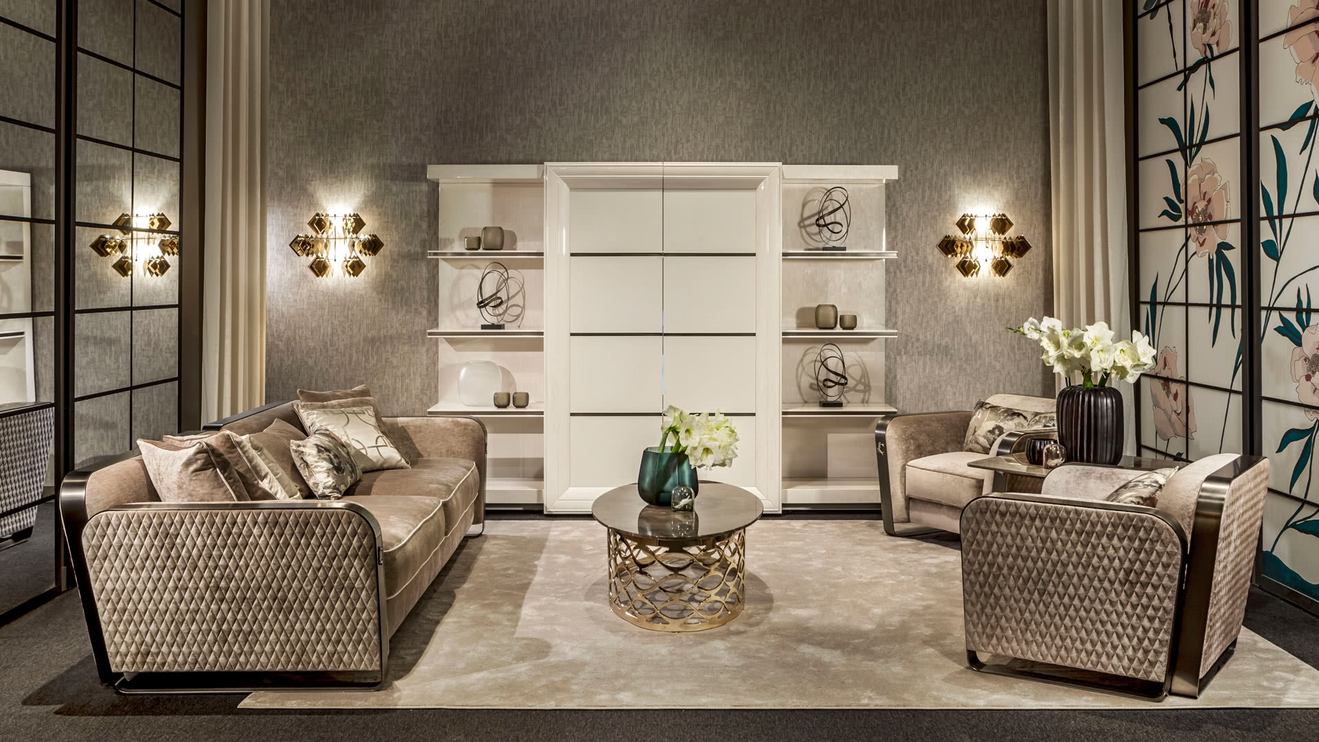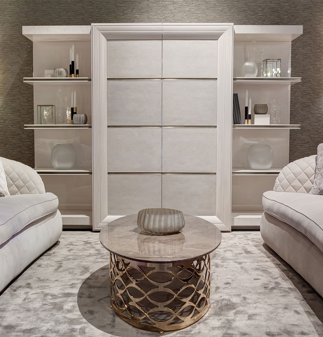 I ripiani sono in legno con profili sagomati e inserto centrale in acciaio oro o bronzo che riprende la decorazione delle ante. Le ante centrali, decorate a mano, hanno cornici perimetrali in massello sagomato e possono scorrere simultaneamente su binari. I pannelli sono invece rivestiti in pelle o decorati a mano e divisi da un intarsio in acciaio oro o bronzo. L'elemento decorativo è realizzato invece in lamiera di acciaio tagliata a laser e decorata a mano. Possibilità di inserire l’azionamento automatico “touch e telecomando”.