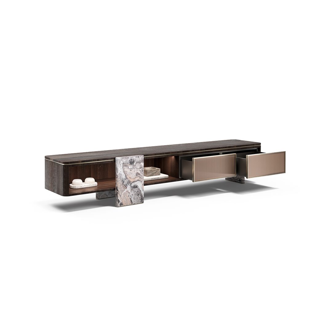 Structure in essence or lacquered. Vertical element and base in marble. 2 drawers with bronzed glass front. Details in metallic finish
