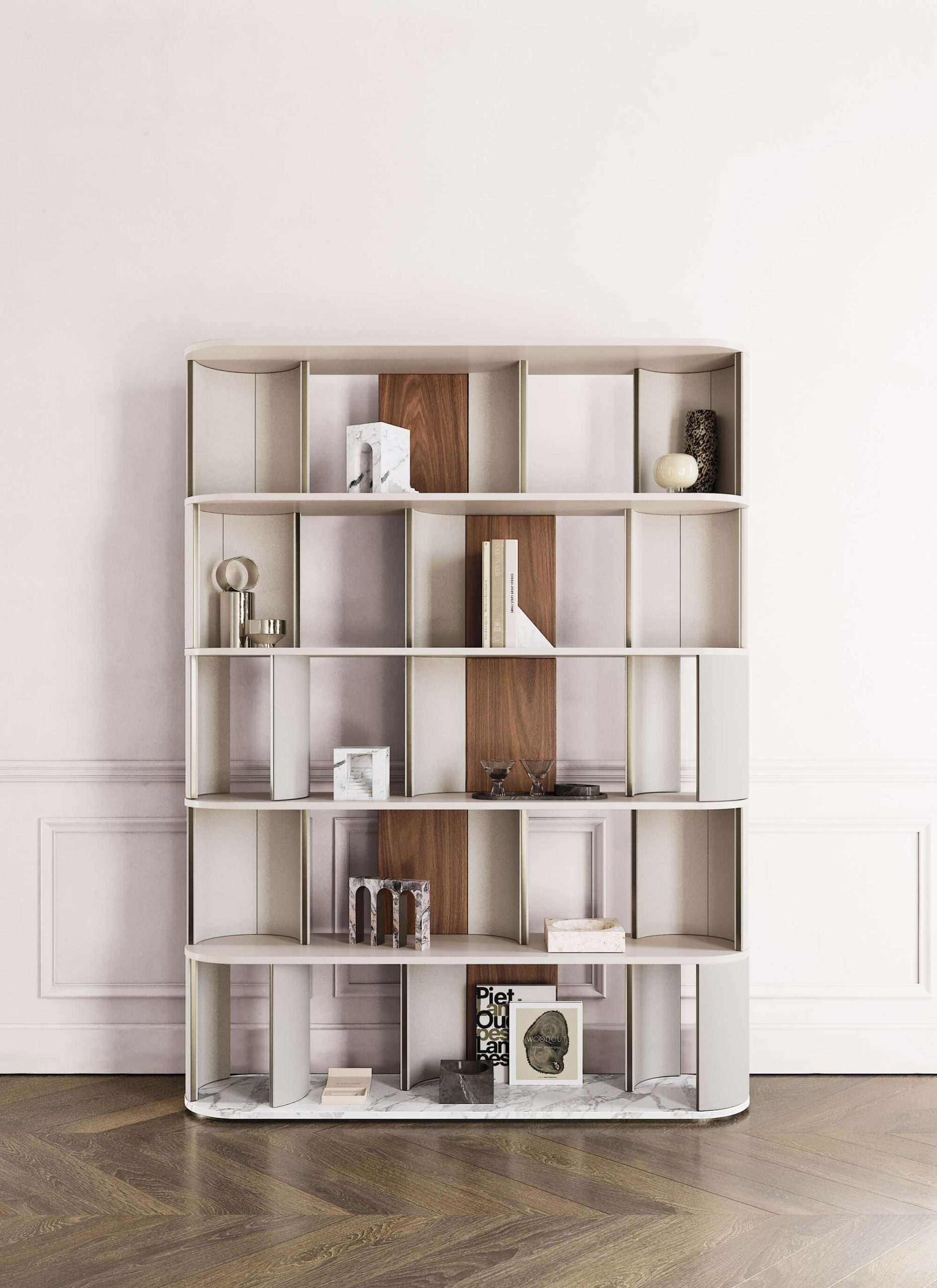 Pannelli di fondo e ripiani disponibili in essenza o laccato.