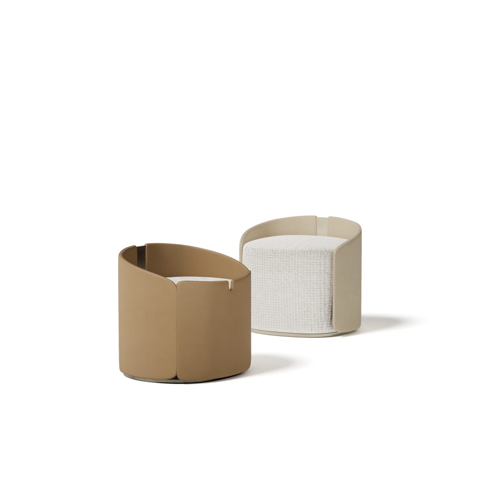 L’armonia tra le forme morbide e sinuose danno vita ad un oggetto eterno ma dal segno pulito e contemporaneo; le linee semplici e i materiali utilizzati gli conferiscono un aspetto raffinato, dove il profondo cuscino viene avvolto da una scocca in maniera molto sofisticata per seguire l’andamento curvo della seduta e mantenere le cuciture a vista perfettamente diritte e regolari.