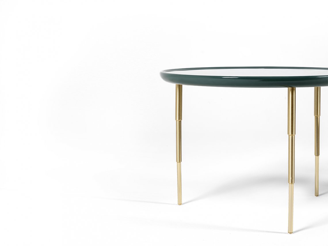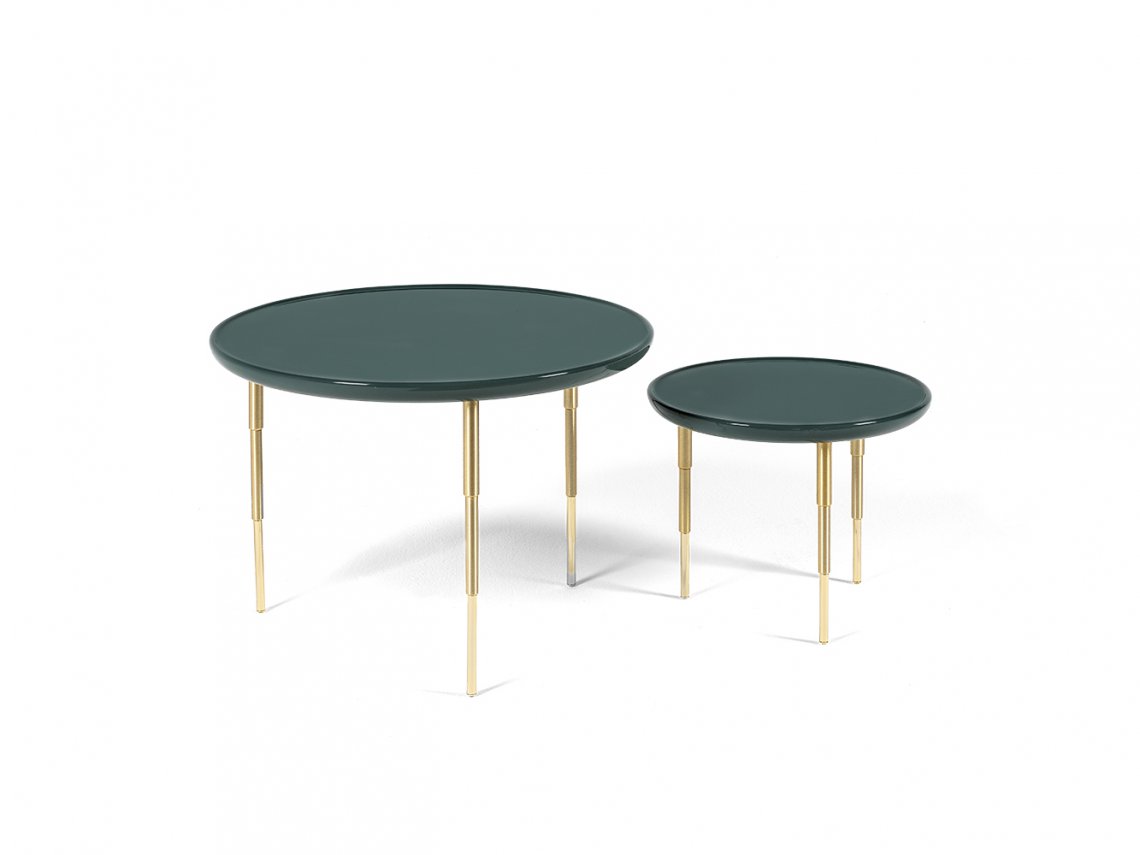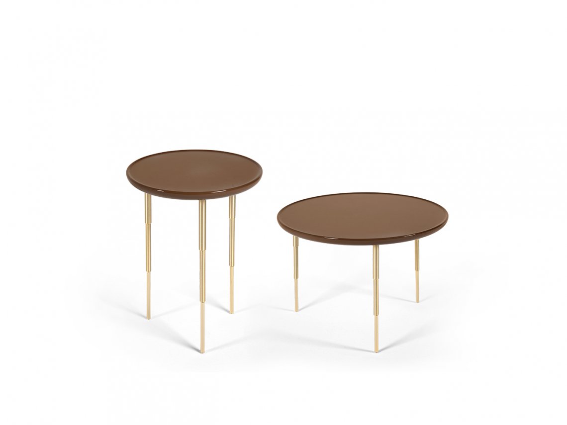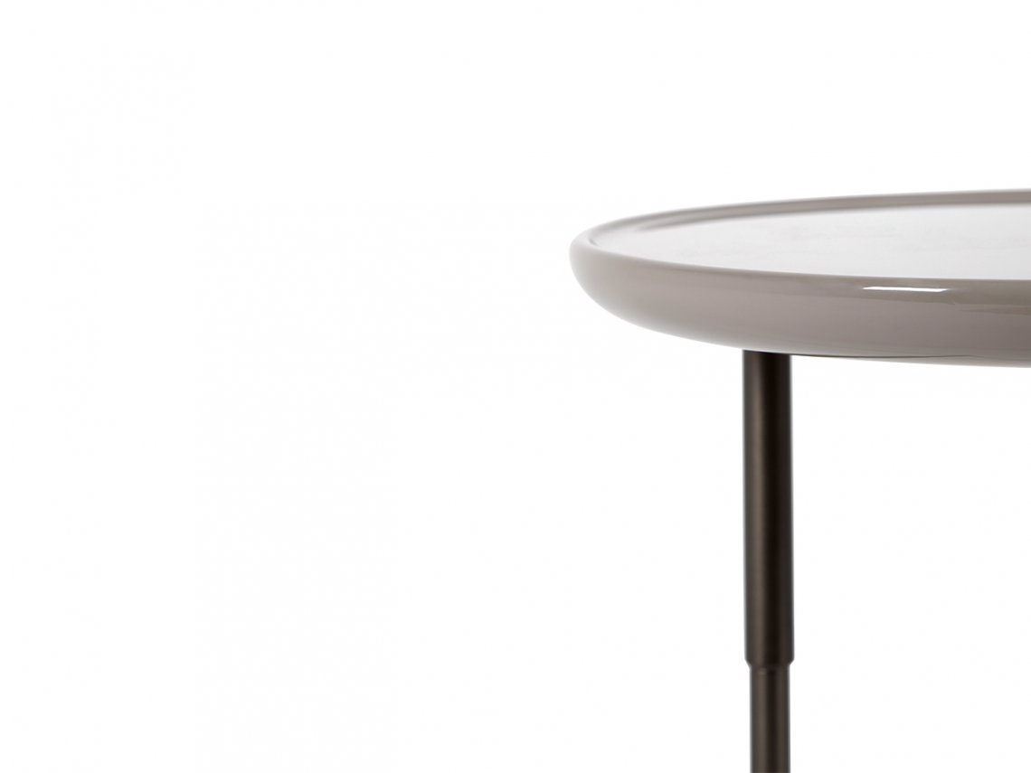 Heron is a “side table” with a light and versatile design. The glossy lacquered top has a rounded edge with a tray shape. The latter is supported by three cylindrical legs that resemble a spyglass in an alternating glossy and brushed finish.