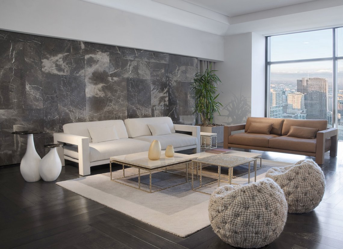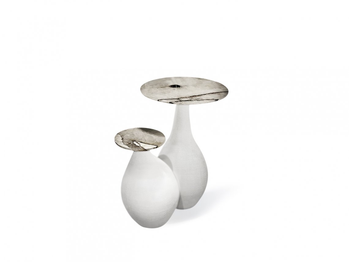 It is a coffee table result of a continuous desire to experience. The base is unusually composed of two vase-shaped bodies different in size and which seem fused together. At the top end there are two circular marble tops with different diameters. The double structure of this coffee table is in ceramic with a three-dimensional finish that can be traced back to the texture of a woven fabric. This piece is particularly suitable for those who are always looking for unique pieces.