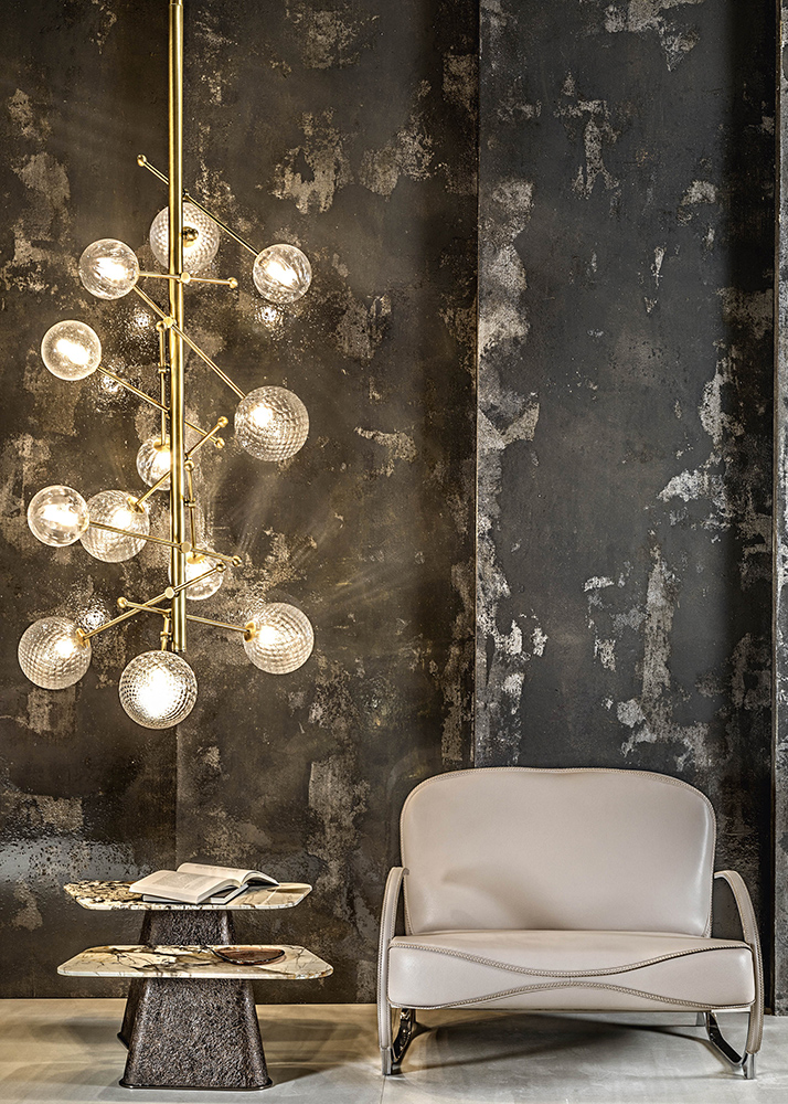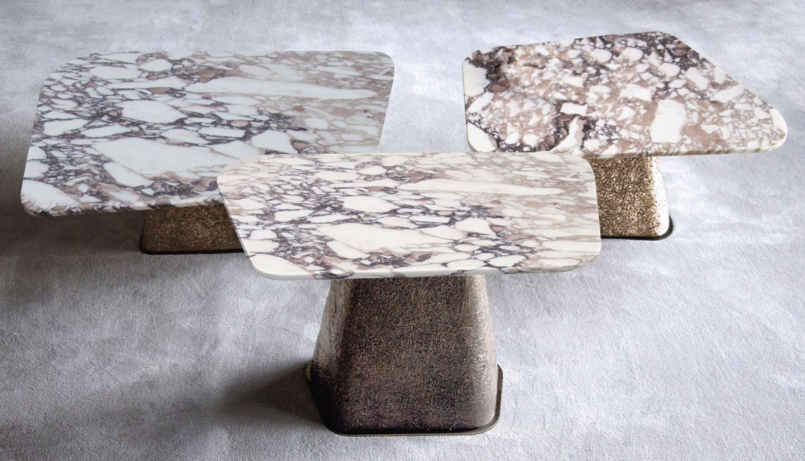 The peculiarity of the coffee table Cheope lies in the eccentric decoration that covers the bases, the designer’s artistic expression. A thin metal sheet is molded thus creating a surface with a strong three-dimensionality emphasized by a chromatic finish that enhances its texture. Available in different chromatic finishes to obtain the best match with the type of “amorphous shape” top in marble. The availability of different sizes allows their use in living areas also in combination with other pieces of different sizes belonging to the same collection.