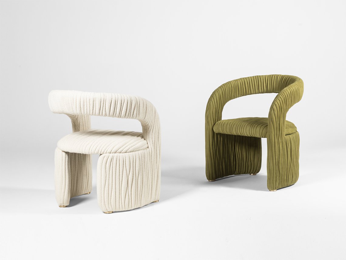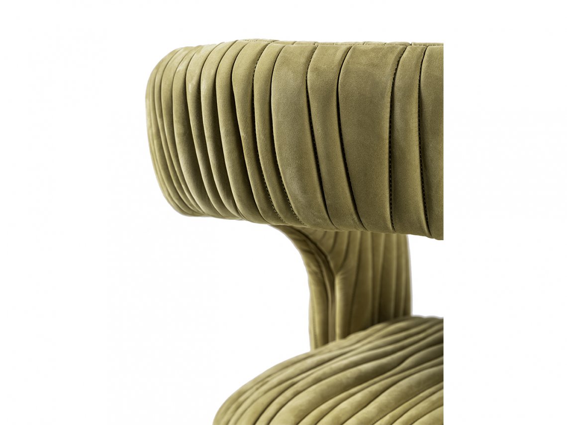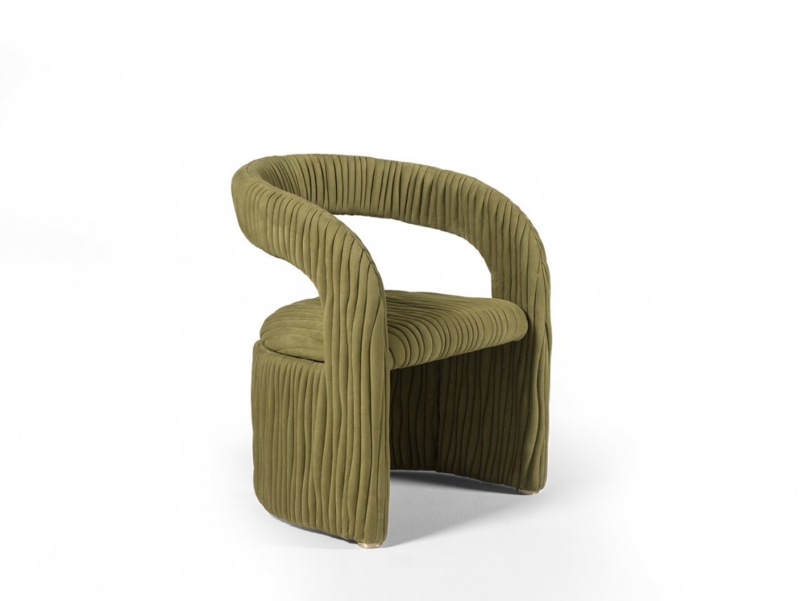 The sinuous shape of the armchair Leaf is reminiscent of the foliage. It is completely upholstered with embroidered leathers or fabrics and a wavy surface, embracing the whole structure, characterizes this armchair.