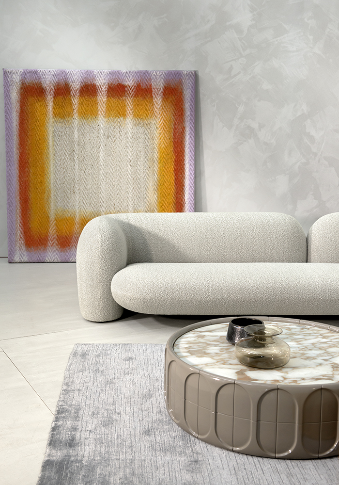 Concave coffee table enriches the living area with a sculptural touch and is characterized by a round shape embellished on the surface by many three-dimensional facets, inspired by the columns of the Roman era. It is available in various colours with a glossy or matt finish.