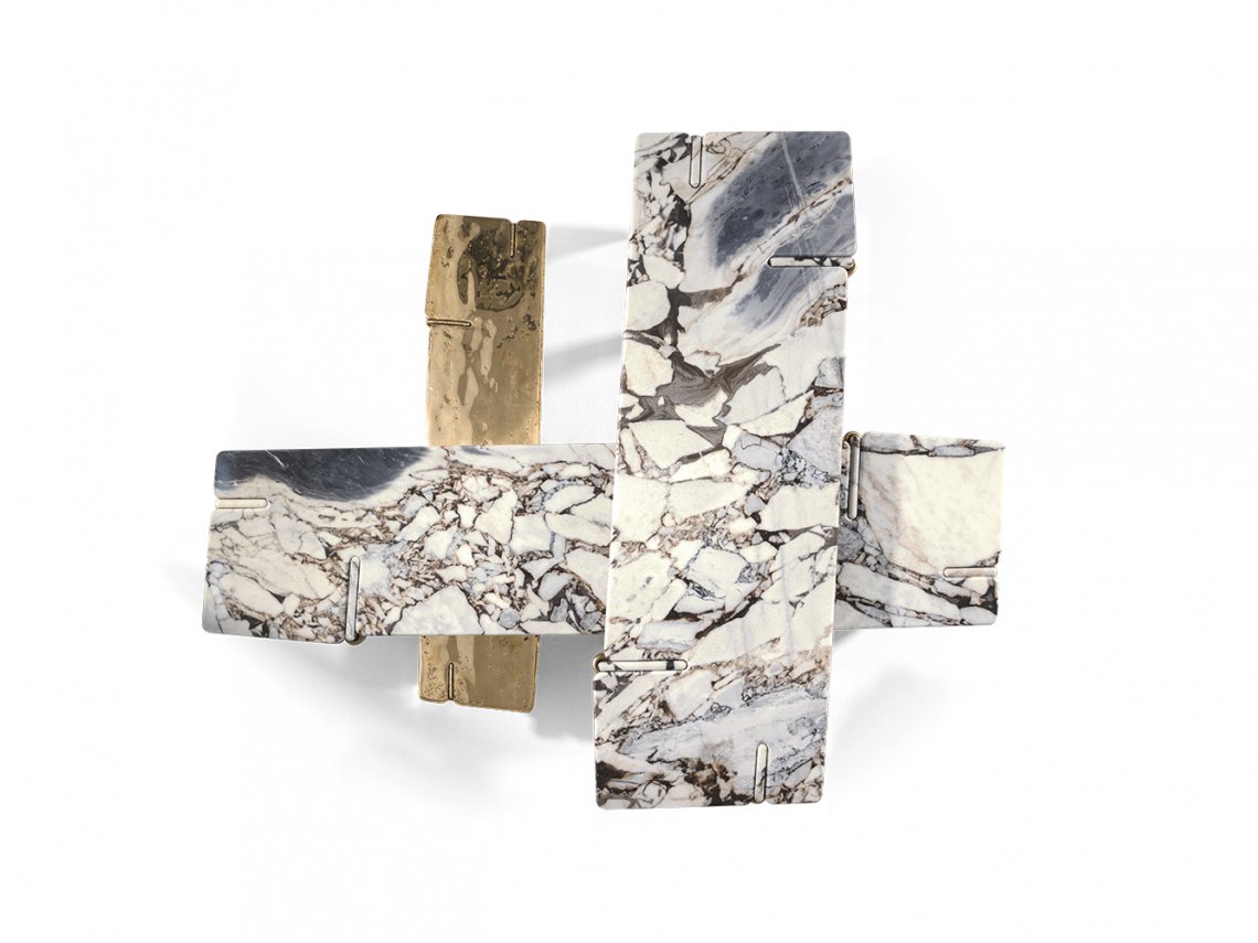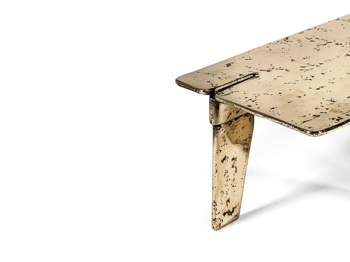 The metal version of the coffee table Overlap is realized by casting bronze into special molds made of sand. The sculptural look of the surface and the use of bronze metal as raw material makes this item a contemporary artwork.