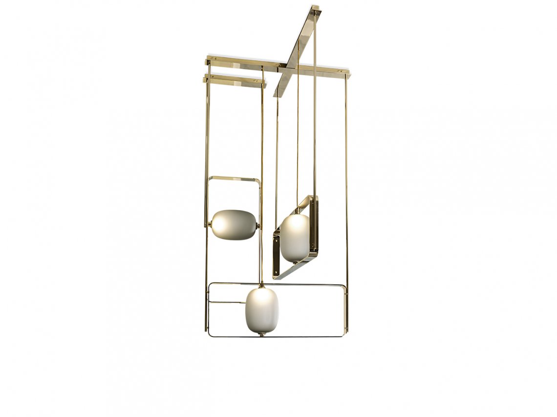 Nova chandelier is characterized by three rectangular metal rings that envelope an oval blown-glass element realized by master glassmakers. The light that spreads through the glass creates suggestive shadows in the environment.