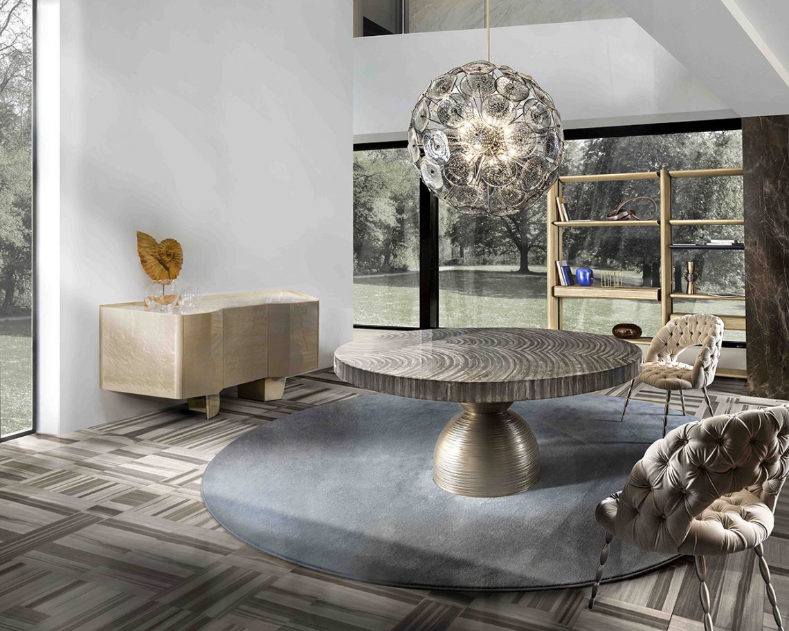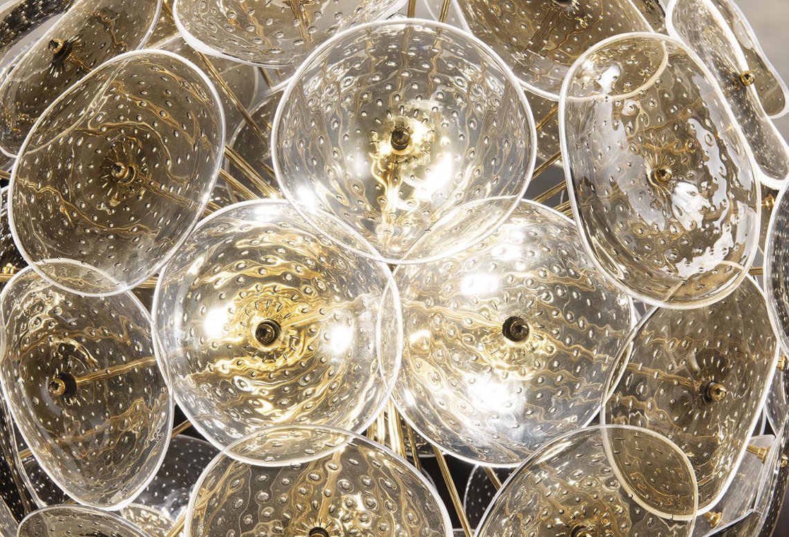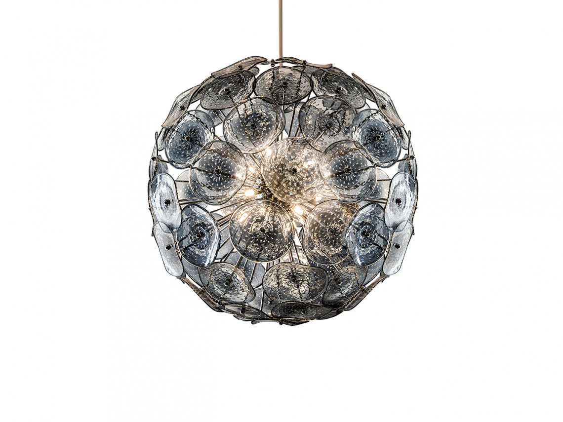 Richmond chandelier has been designed to astonish the customers: from a central metal sphere come out thin metal bars that support handmade glass petals realized by master glassmakers from Venice area. A traditional glass technique creates bubbles inside the petals which are able to spread beautiful light reflections. The glass is available in gold or in blue colour.