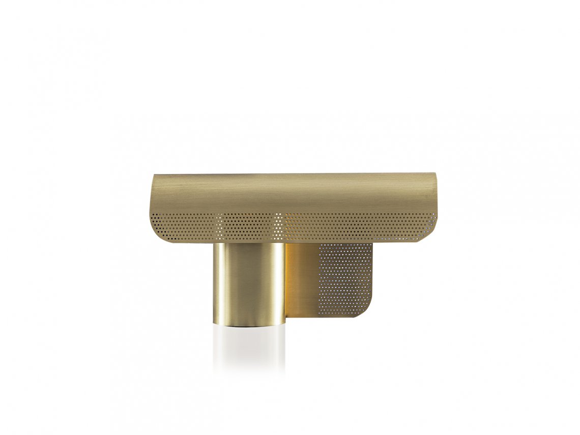 Table lamp Florence represents the embrace of two metal leaves that bend both on themselves and one onto the other, creating an extremely refined and harmonious shape. The light comes out from small holes arranged on the surface making this element suitable for small storage units of bedrooms or for a writing desk in a office.