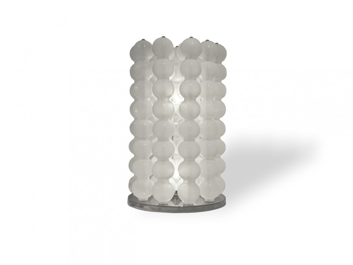 The table lamp Opalino is composed by blown glass elements as result of artistic skills of master glass makers. These spheres are connected one to the other and once enlightened, a play of lights is radiated in the room.