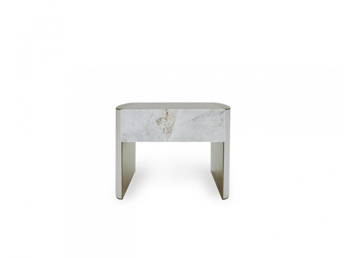 Night table Linfa is an example of the combination of different raw materials able to enhance preciousness to this piece of furniture: marble inserts become drawer frontals that match with the rounded lacquered structure while metal parts become decorative details that separate themarble from the structure itself. It is highly recommended for bedrooms.
