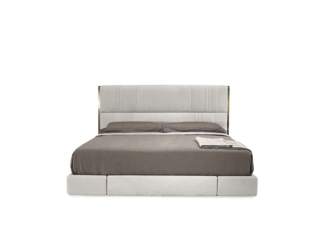 Novabed presents headboard and siderails upholstered in leather or fabric where vertical stitchings alternate with parallel seams while on lateral sides of the headboard metal details recall those that characterize the other items of this collection. This bed besides being available with standard headboard, it is available with a wider headboard that envelops the night table.