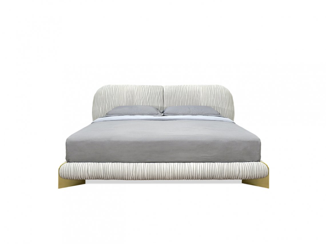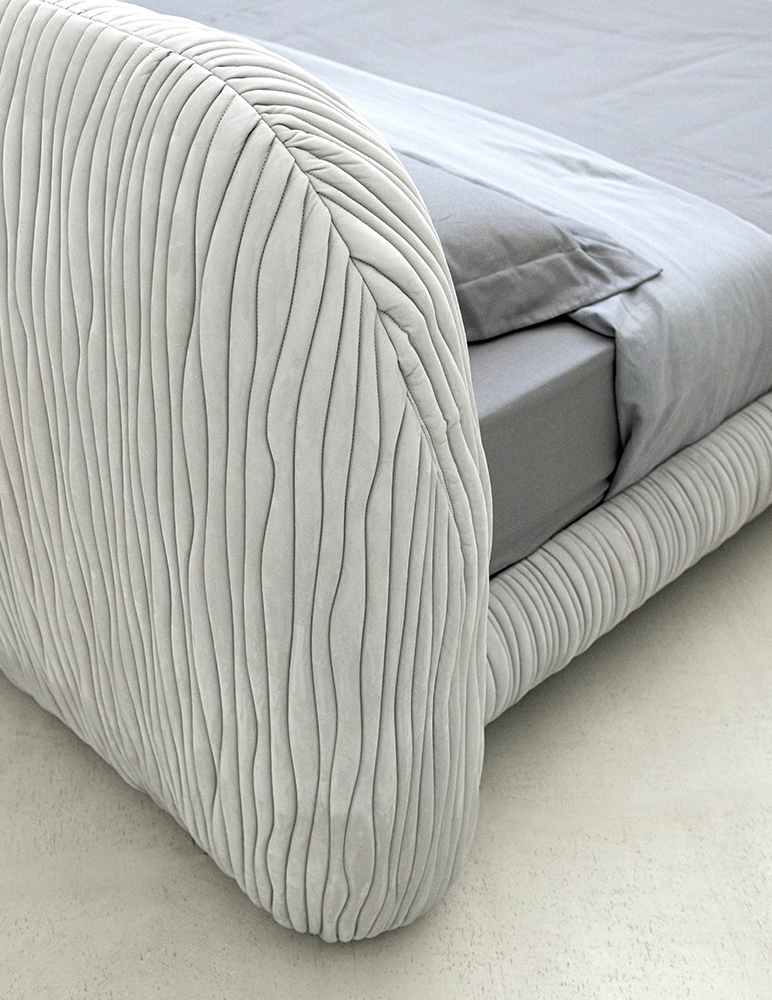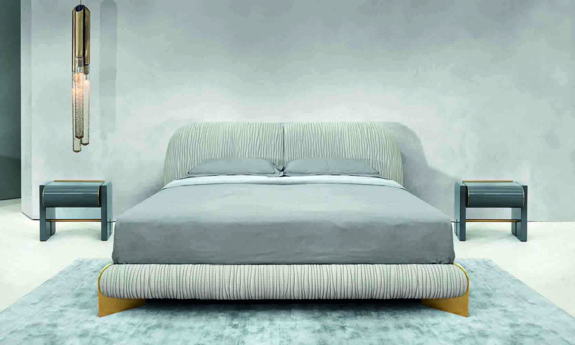Leaf bed is characterized by a wavy pattern embroidery that covers the entire surface, enhancing the sinuosity of its shape. The metal details that support the bed frame give a touch of uniqueness. This bed is available completely upholstered in leather or quilted fabric.