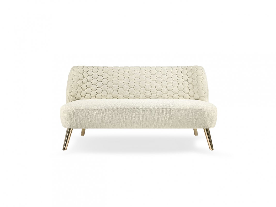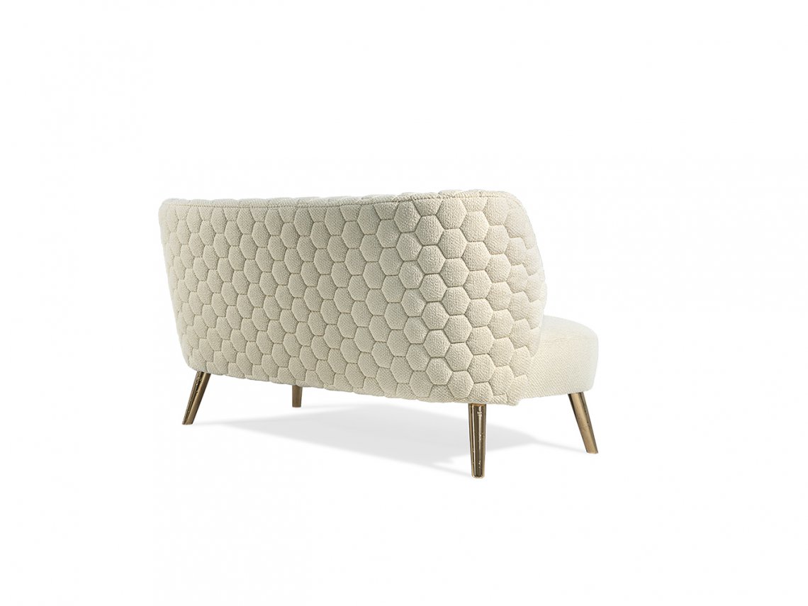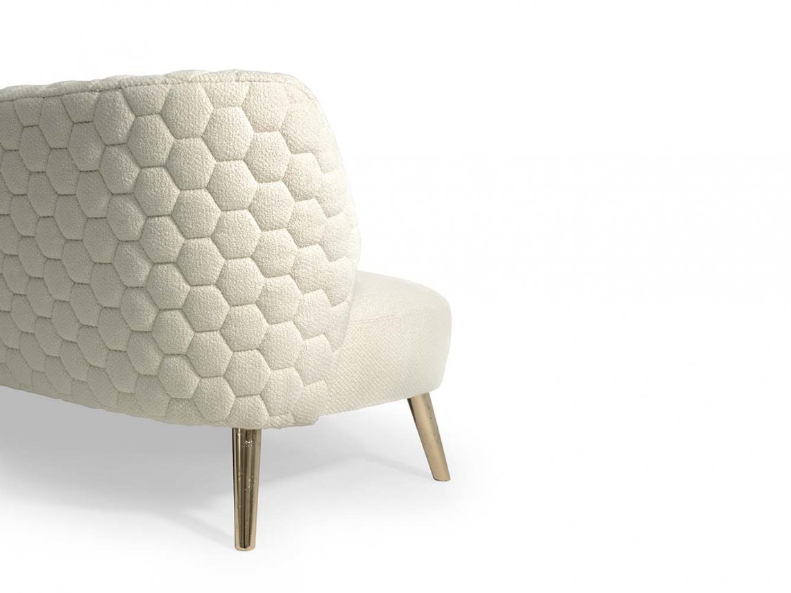 The enveloping and comfortable sofa Marilou can be upholstered only with selected textured fabrics. The backside is characterized by a quilting embroidered with hexagonal design. The bronze metal feet are realized with the ancient sand casting technique that conveys an artistic touch to the sofa.