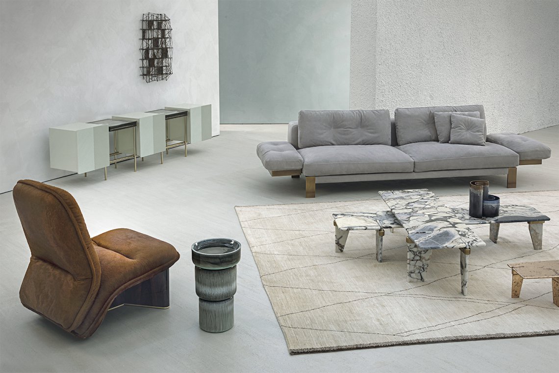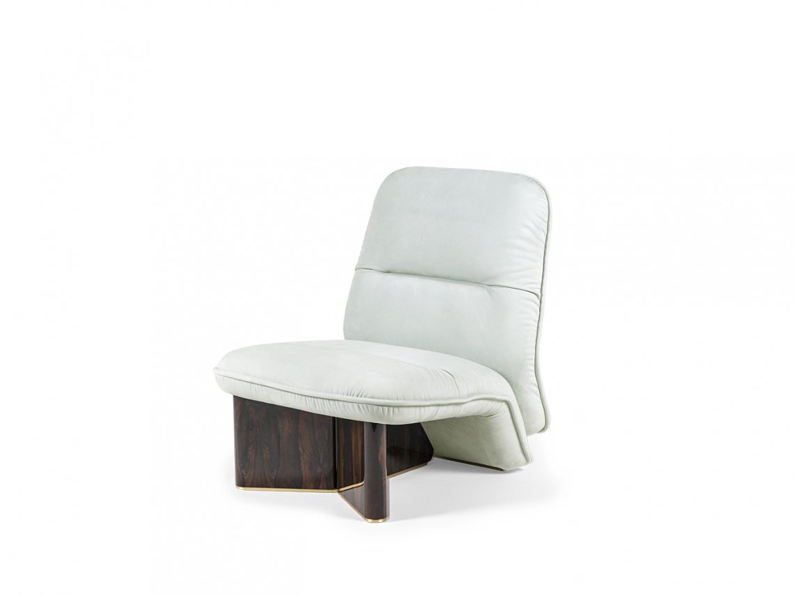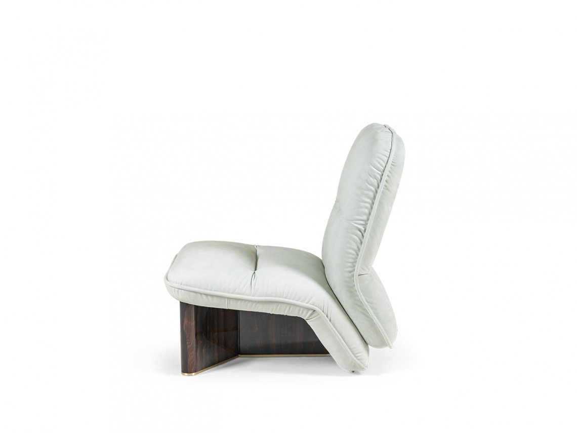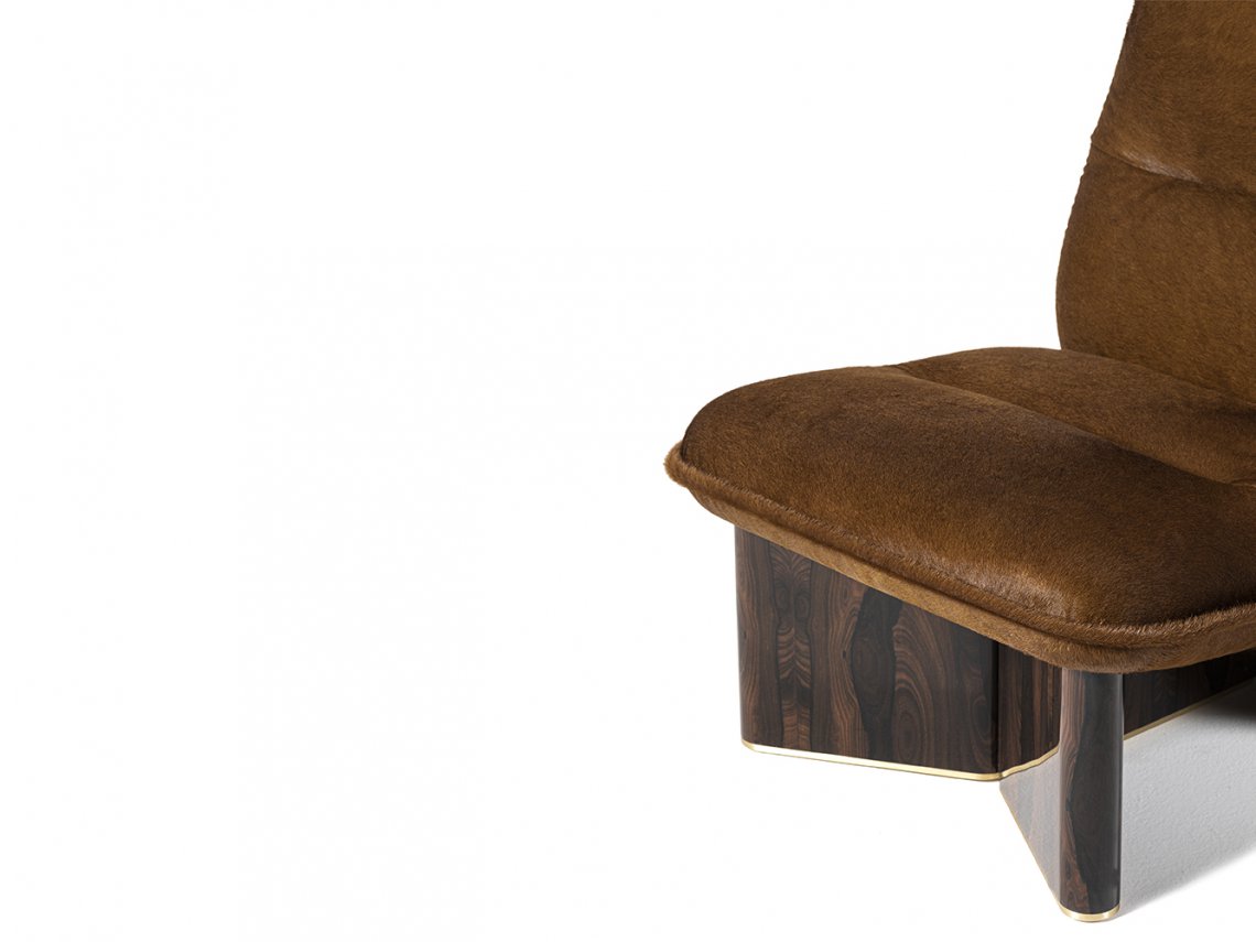 The armchair Ypsilon is the result of the union of two upholstered elements, seat and backside that are perfectly symmetrical. The bovine leather with pony look covers the whole structure. The same ypsilon shape is also recognizable in the base covered with precious ziricote wood and metal details in matt gold finish.