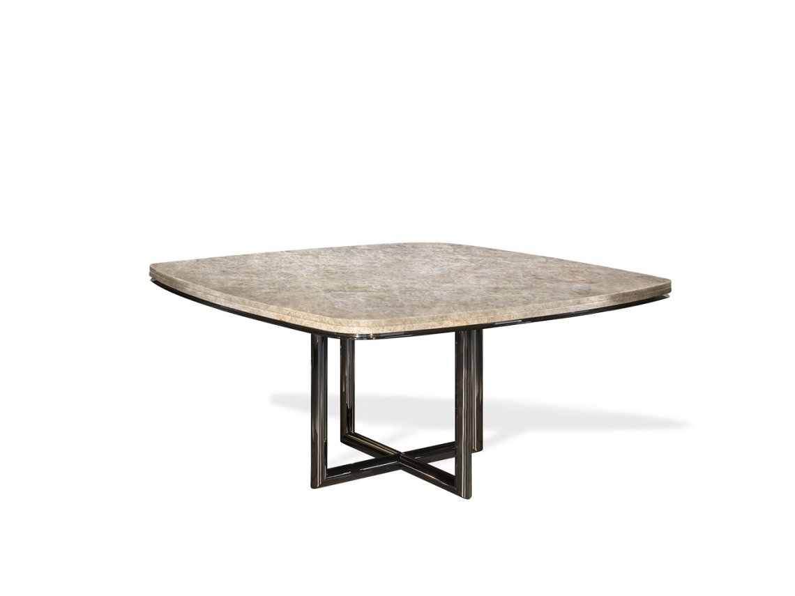 The table Grant is characterized by a remarkable marble top supported around the perimeter by a metal edge, which increases its thickness. A metal base with a tubular cross motif gives further elegance and refinement to this table, which is also available in a rectangular shape with rounded corners towards the ends.