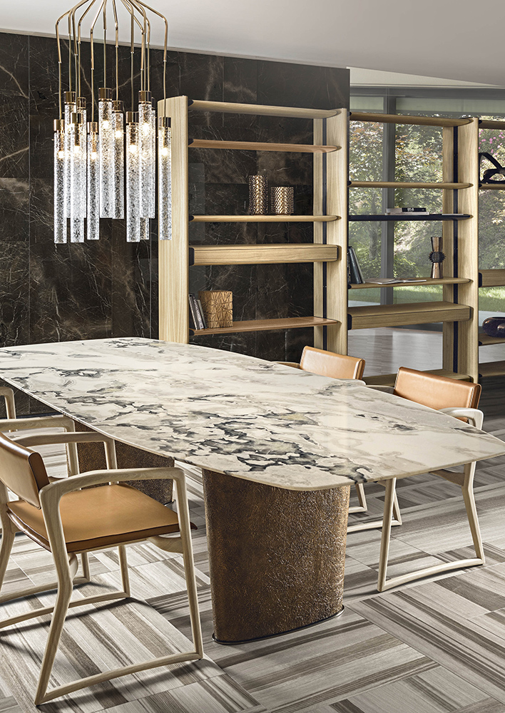 The peculiarity of the table Cheope lies in the eccentric decoration that covers the oval bases, the designer’s artistic expression. A thin metal sheet is molded thus creating a surface with a strong three-dimensionality emphasized by a chromatic finish that enhances its texture. Available in different chromatic finishes to obtain the best match with the type of marble chosen. Thanks to the wide range of sizes available for the top, this table fits any dimension of dining room.