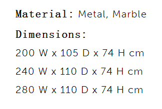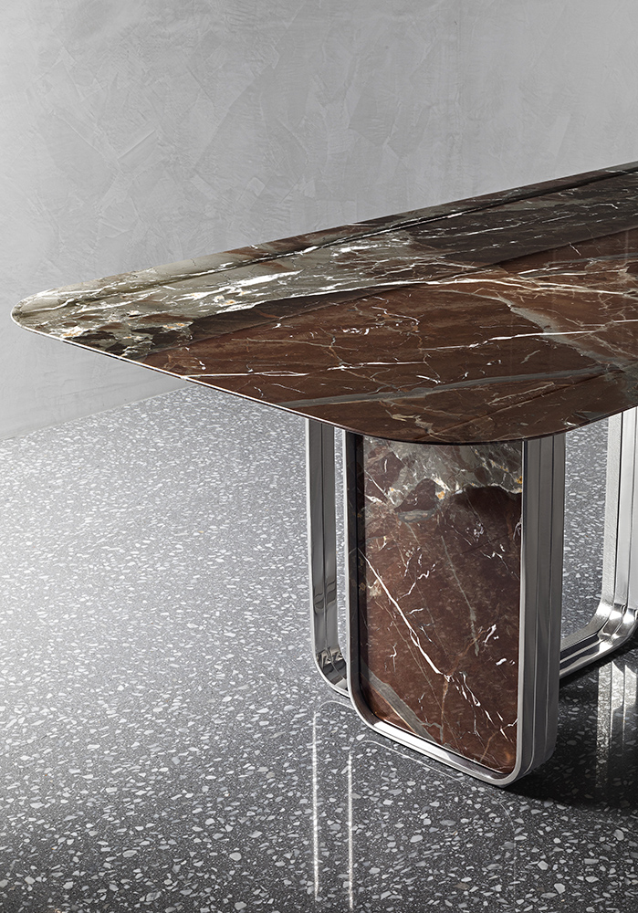 The uniqueness of rectangular tables Nova is represented by the double brass base that envelops the marble slabs like a ribbon enhancing the natural veins of the stone. The metal parts, that are shaped in a very precious way, are proposed both in shiny and matt finishes and some of them are decorated by hand with a refined three-dimensional effect. Besides the rectangular table exists also the round version available in different sizes.