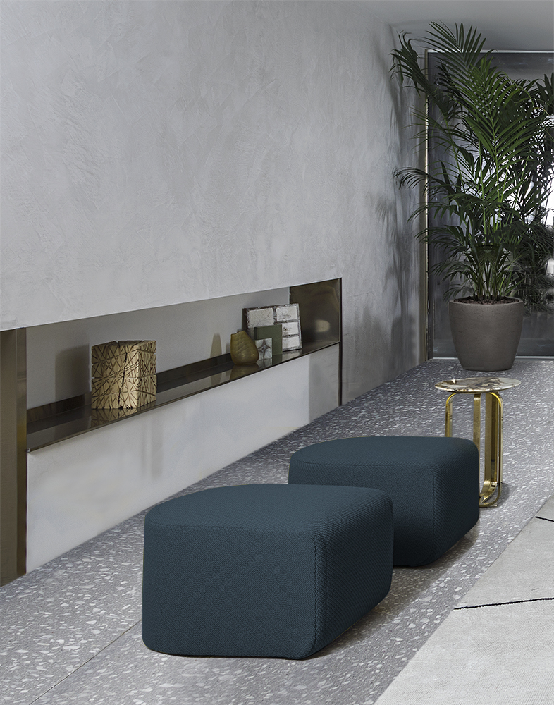 Characterized by a rounded shape on one side and a cubic shape on the opposite side, the pouf Marilyn has small dimensions perfect for any style of living room. Its covering has a border marked by a double stitching that can be seen and felt when touching, aesthetic expression of the designer’s stylistic choice. The use of brightly colored fabrics fully enhance the pouf and make it more contemporary. It is also available in leather.
