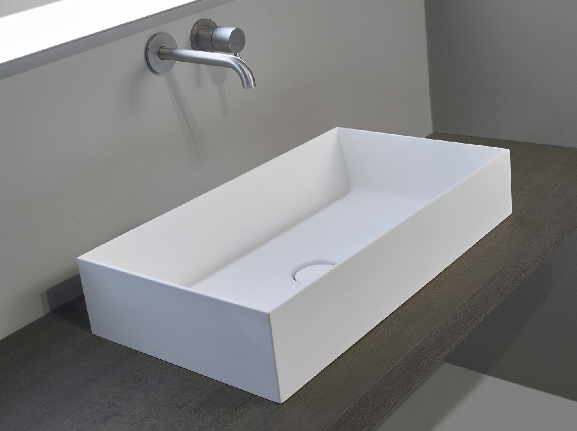 Lavabo da appoggio o semi incassato, in Monolith, senza troppo pieno, tappo piletta in Monolith.