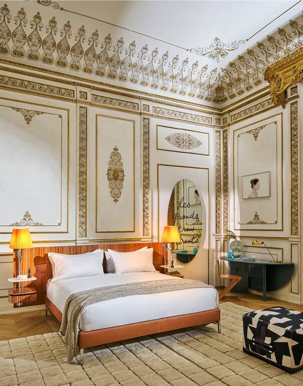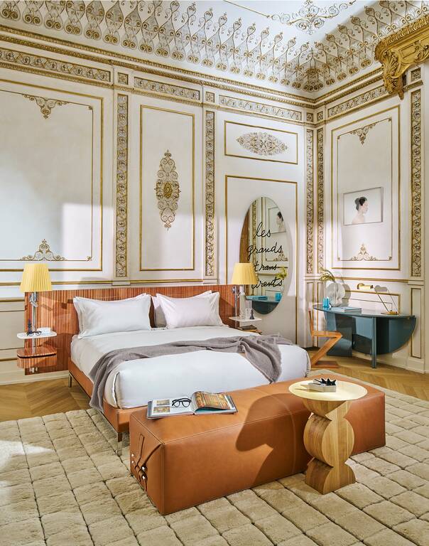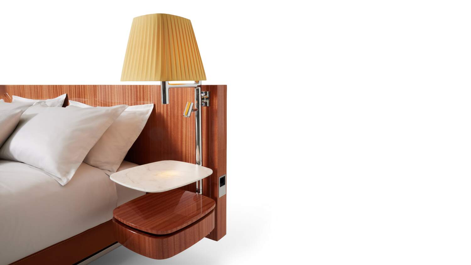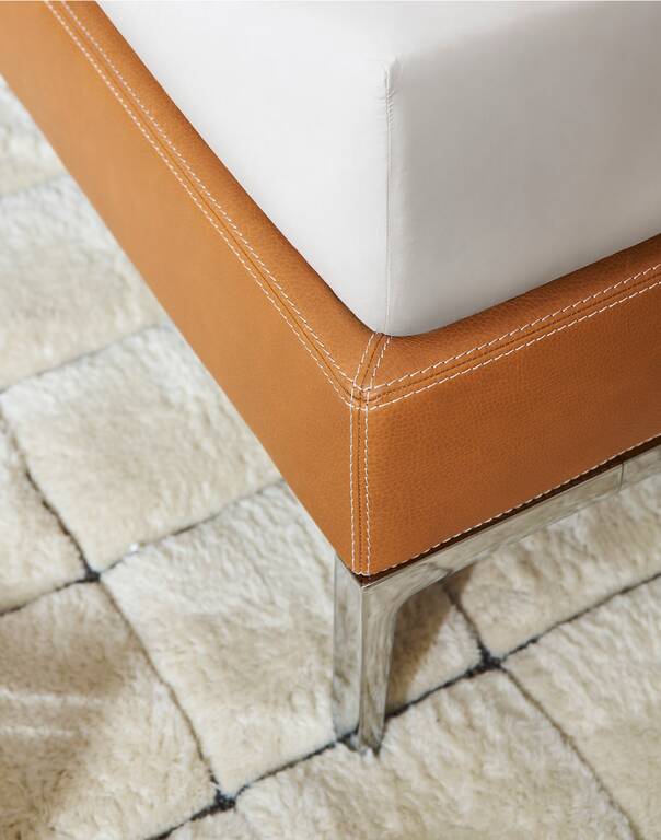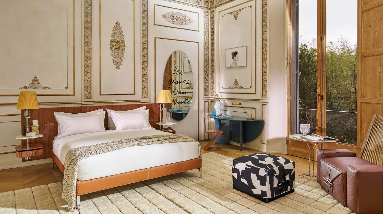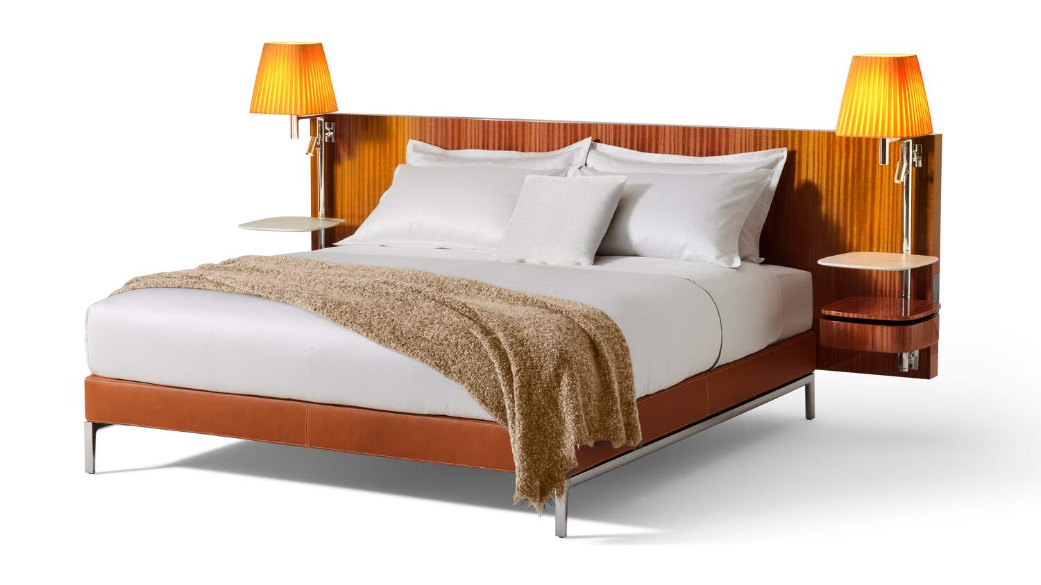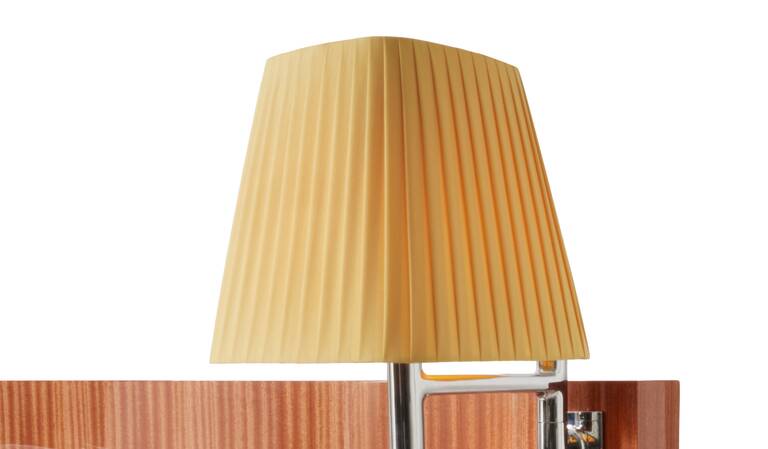 Philippe Starck在這款寬大、質(zhì)感十足的床上留下了鮮明的印記,床頭板只有一種尺寸,有三種珍貴的木質(zhì)飾面:桃花心木、亮面黑檀木和啞光梧桐木。針對(duì)每種木材,我們都會(huì)從珍貴的材料紋理和強(qiáng)烈優(yōu)雅的色調(diào)中汲取靈感,開(kāi)發(fā)出精美的飾面。與該系列的母款一樣,床頭板的兩側(cè)都有一根鑄鋁桿,桿上安裝了一個(gè)織物大燈罩和一個(gè)可調(diào)光和轉(zhuǎn)向的LED小燈。兩個(gè)懸掛式床頭柜具有大理石桌面和一個(gè)木質(zhì)抽屜,抽屜的表面處理與床頭柜相同,配有兩個(gè)電插座或USB插座。Volage EX-S Night Wood繼承了Somewhere El-S系列的美學(xué)和馬鞍細(xì)節(jié),如象牙色縫線和床周框覆面的粗紋理皮革。