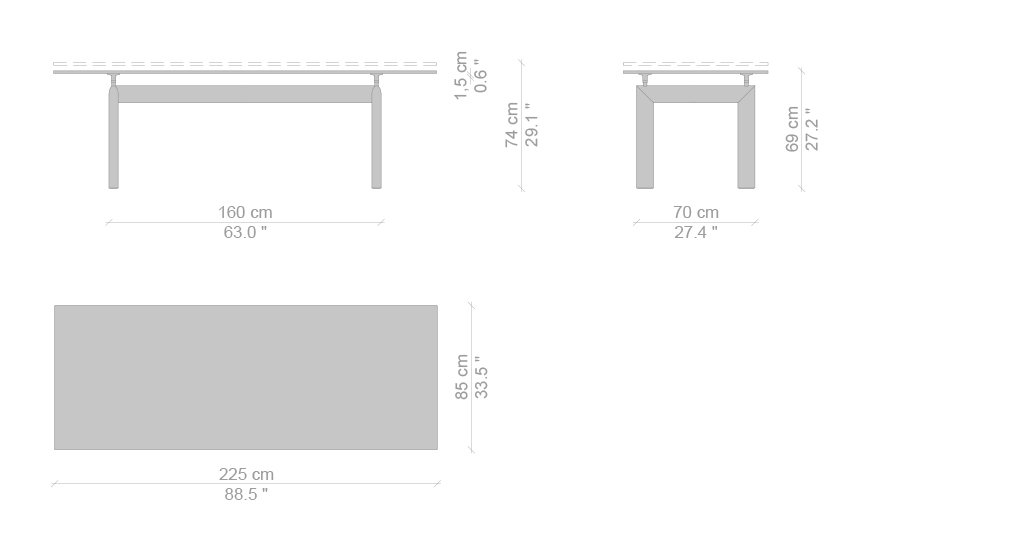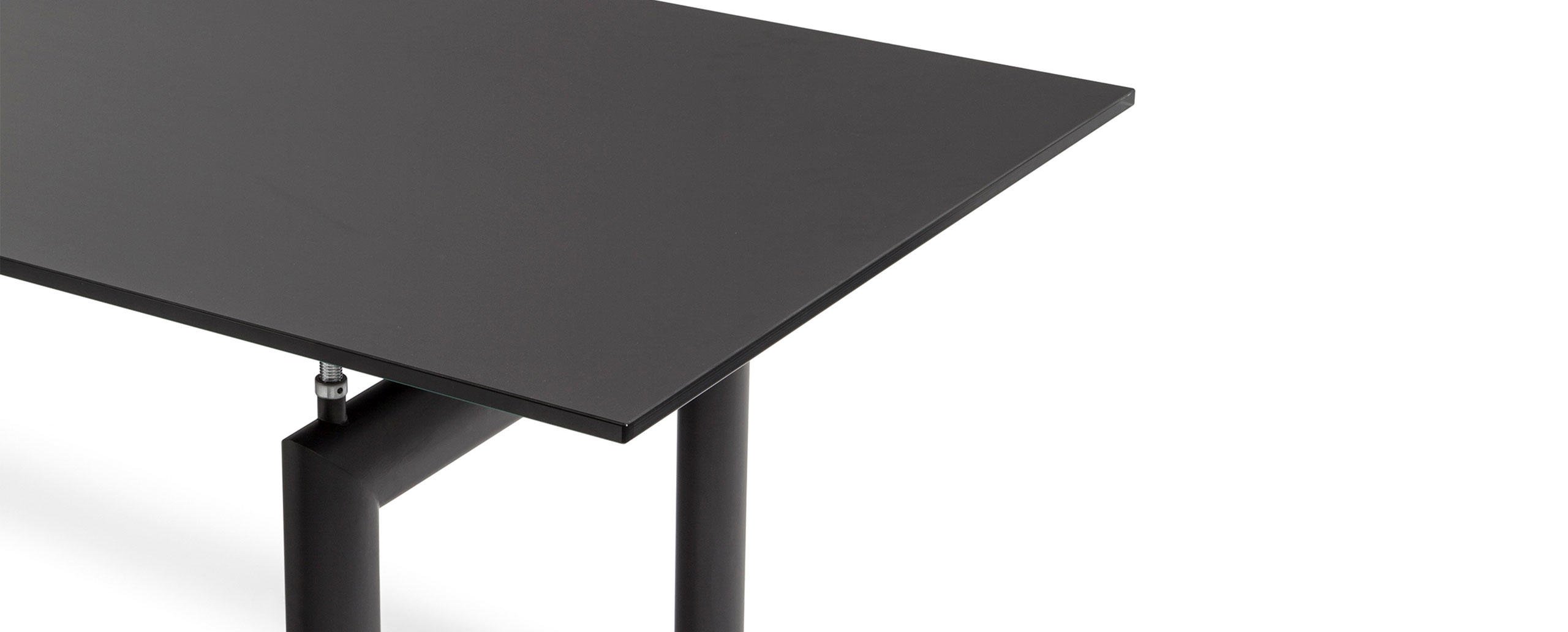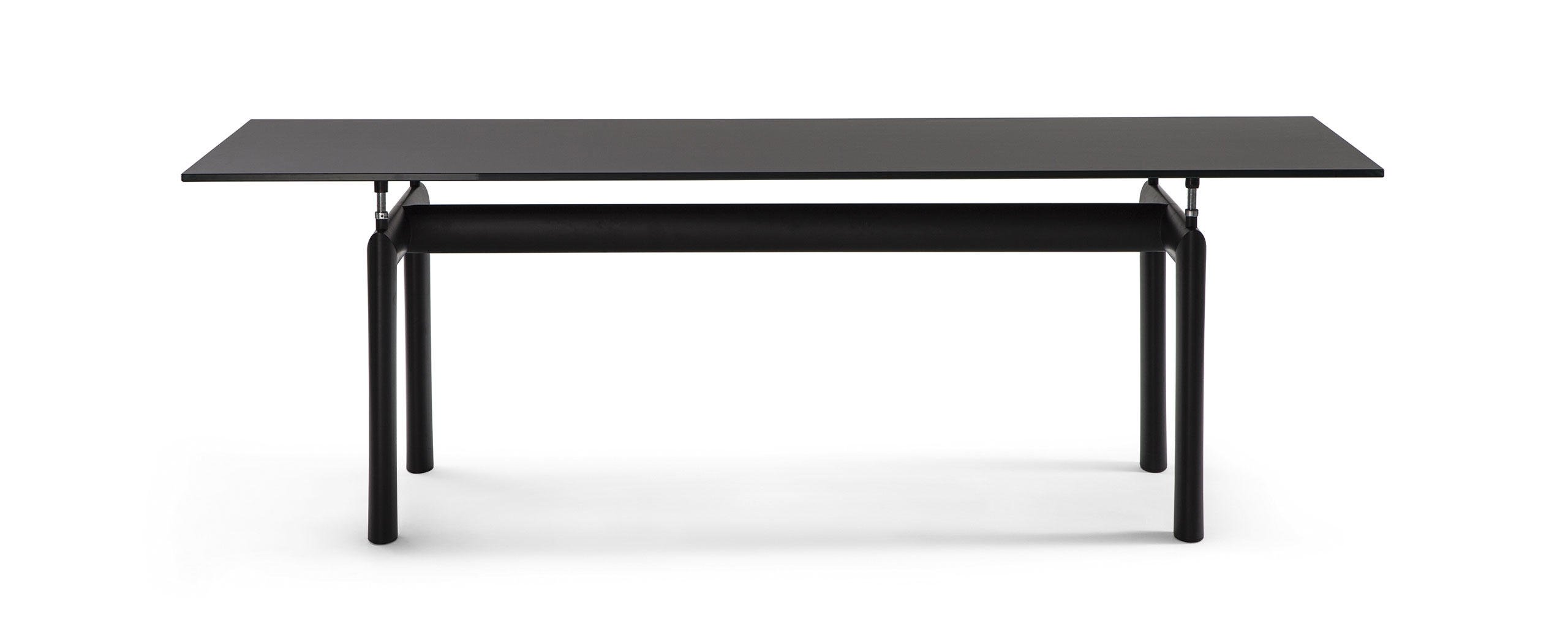 L’idea di base del tavolo LC6, presentato nel 1929 al Salon D’Automne, risiede nella distinzione tra l’elemento portante e l’elemento portato, ovvero tra il basamento e il piano. L’autonomia delle due parti è evidenziata da quattro sostegni intermedi che fungono sia da regolatori di livello che da distanziatori tra la consistenza del supporto e le linee esili del piano. In particolare, il basamento fu disegnato nel 1928 facendo riferimento i profili ovoidali impiegati nel settore aereonautico per separare le ali dei biplani. Il modello attuale presenta il basamento in acciaio verniciato nei colori della palette di Le Corbusier, con piano disponibile in cristallo, vetro stampato, legno, o nelle pregiate finiture in marmo bianco Carrara e marmo nero Marqui?a.