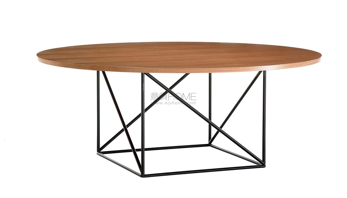 Le Corbusier progetta questo tavolo nel 1958 elaborando un design organico e insieme razionale. La costruzione distintiva del modello parte dall’interpretazione di due figure geometriche contrapposte: il cerchio, trasformato in un robusto piano di rovere, si poggia sulla base di sostegno a forma di cubo, composta da tubolari in acciaio combinati in piani ortogonali. Lo stile essenziale e dinamico consegna alla modernità un oggetto di grande valore estetico, destinato ad arredare abitazioni o sale conferenze ospitando fino a 10 persone.