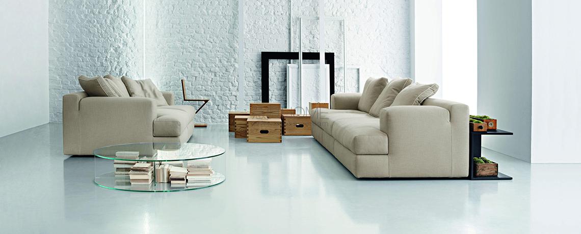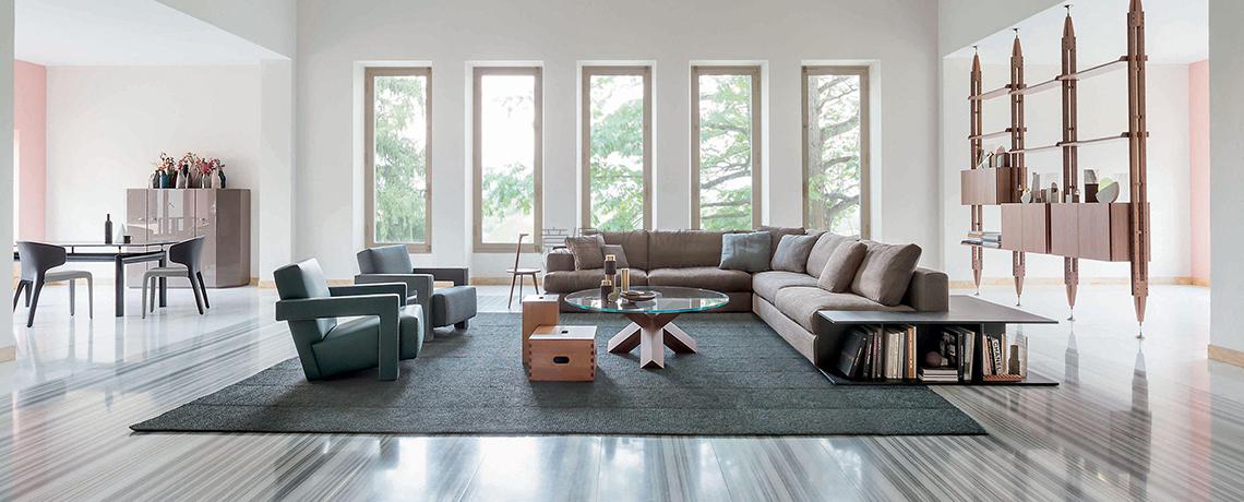 Un divano a terra dallo spirito poliedrico e modulare, plasmabile in configurazioni estremamente confortevoli e accoglienti, pensate per il relax e la conversazione. Disponibile in due profondità diverse e con due diverse imbottiture, piuma e ovatta di poliestere, Miloe si adatta perfettamente ad ogni scenario grazie al suo abaco ampio e duttile, che nel corso degli anni è stato sviluppato per inserire una chaise longue e moduli di dimensioni ridotte di grande flessibilità. La sensazione di comfort e l’eleganza grafica del design sono enfatizzati dai soffici cuscini in varie tonalità e dimensioni, personalizzabili con profili in gros-grain disponibili in quattro tonalità naturali. Il divano è disponibile con rivestimento in pelle o tessuto sfoderabile e si competa di una serie di tavolini in rovere, noce canaletto o cristallo.
