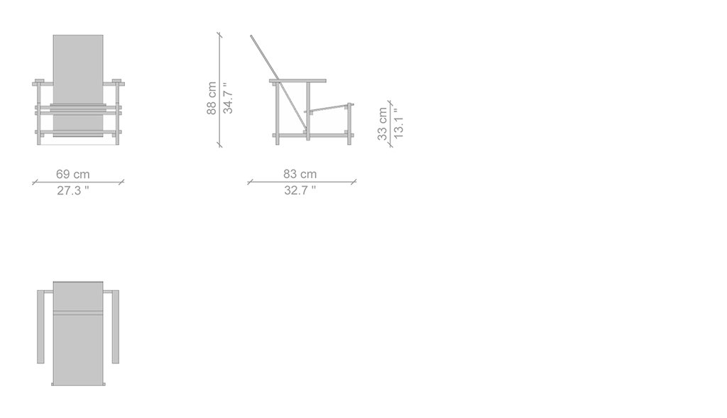 Una sedia-scultura dalla forma pura e razionale. Un autentico manifesto dell’approccio oggettivo del Neoplasticismo, promosso dal movimento olandese De Stijl nel 1917. Una poetica incoraggiata anche da Piet Mondrian, il cui obiettivo era la ricerca della natura essenziale delle cose, l’equivalenza armonica dei colori e l’uso esclusivo dell’angolo retto. Rietveld lavora ai primi prototipi nel 1918, esprimendo la filosofia di organizzazione dello spazio attraverso la monocromia degli elementi. In seguito applica la differenziazione cromatica per separare le parti costruttive in base alle funzioni, arrivando ad accostare la struttura nera alle parti di appoggio colorate. Da qui anche la variazione del nome dell’opera, che da Slat Chair divenne Red and Blue.