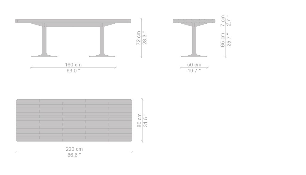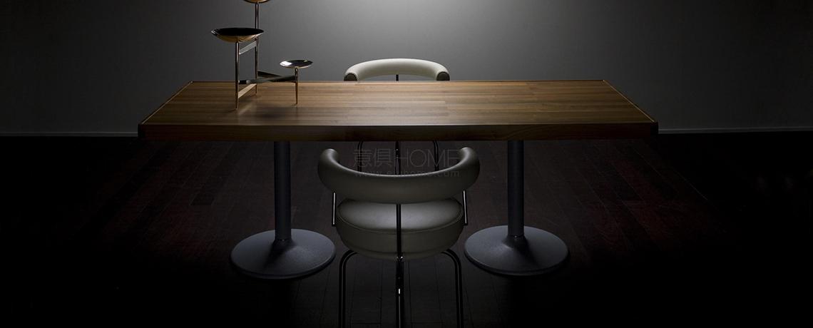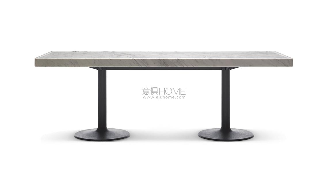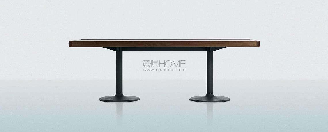 Il modello fu progettato da Le Corbusier, Charlotte Perriand e Pierre Jeanneret in due esemplari. Il primo, disegnato nel 1934 per l’appartamento parigino di Le Corbusier, presentava il piano in marmo, mentre il secondo, realizzato nel 1935 per la Maison du Jeune Homme di Bruxelles, aveva il piano in ardesia. Il tavolo elegante e imponente è definito da un basamento in ghisa grigia con piedi circolari, ampi e stabili e ritti slanciati. Su questa struttura portante si appoggia saldamente il piano massiccio in marmo di Carrara o in noce naturale. L’impatto scultoreo lo rende un arredo iconico di grande pregio e versatilità, facilmente interpretabile sia in scenari classici che moderni.
