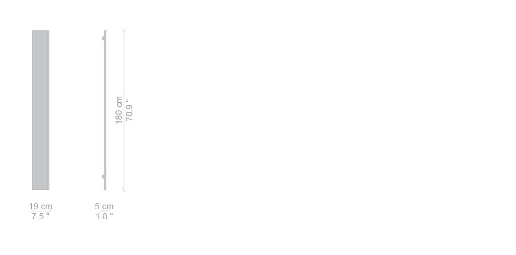 Lo specchio realizzato da Studio Simon si presenta con un vetro molato su un lato verticale, dotato di supporto verniciato poliestere con finitura lucida specchiante. L’oggetto simula una feritoia, un taglio di luce nel muro. Un lungo rettangolo che riflette ciò che lo circonda.