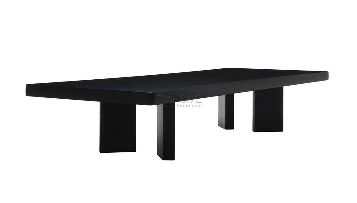 Un tavolino in massello caratterizzato dall’estrema complessità tecnologica e dalla semplicità formale del design, ideato nel 1969 per l’Ambasciata del Giappone a Parigi. La sua sintesi ha origine dalla forte emozione provata da Charlotte Perriand alla vista casuale di un masso quasi ciclopico, il cui peso era sensibilmente attenuato dalla levigatura naturale dovuta all’erosione marina. Da qui derivano lo spessore del piano e lo sviluppo concavo del bordo, che trasmettono al modello una forte connotazione estetica e una sensazione di notevole leggerezza. Il contrasto tra l’impatto figurativo e la percezione razionale del peso reale definiscono l’unicità di questo mobile, che grazie alle elaborate tecniche di realizzazione resiste alle deformazioni del tempo cui sono abitualmente soggette le strutture in legno.