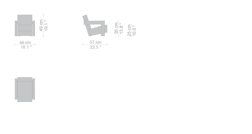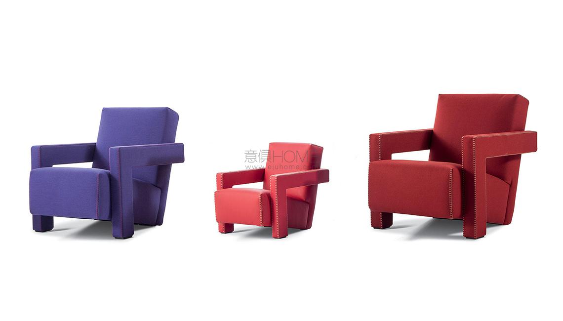 Poltroncina con telaio portante, sedile e schienale in multistrato di pioppo. Braccioli in legno massello di pioppo. Imbottitura in poliuretano espanso e ovatta di poliestere. Rivestimento non sfoderabile in tessuto (in due tonalità di rosso) o in ecopelle (nei colori rosso, giallo, blu) con impunture a vista in colore bianco. Piedini in materiale plastico di colore nero.