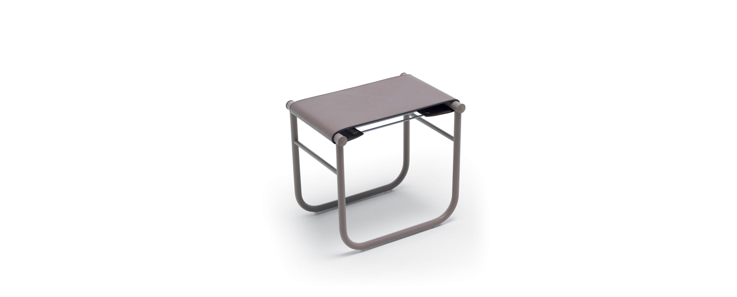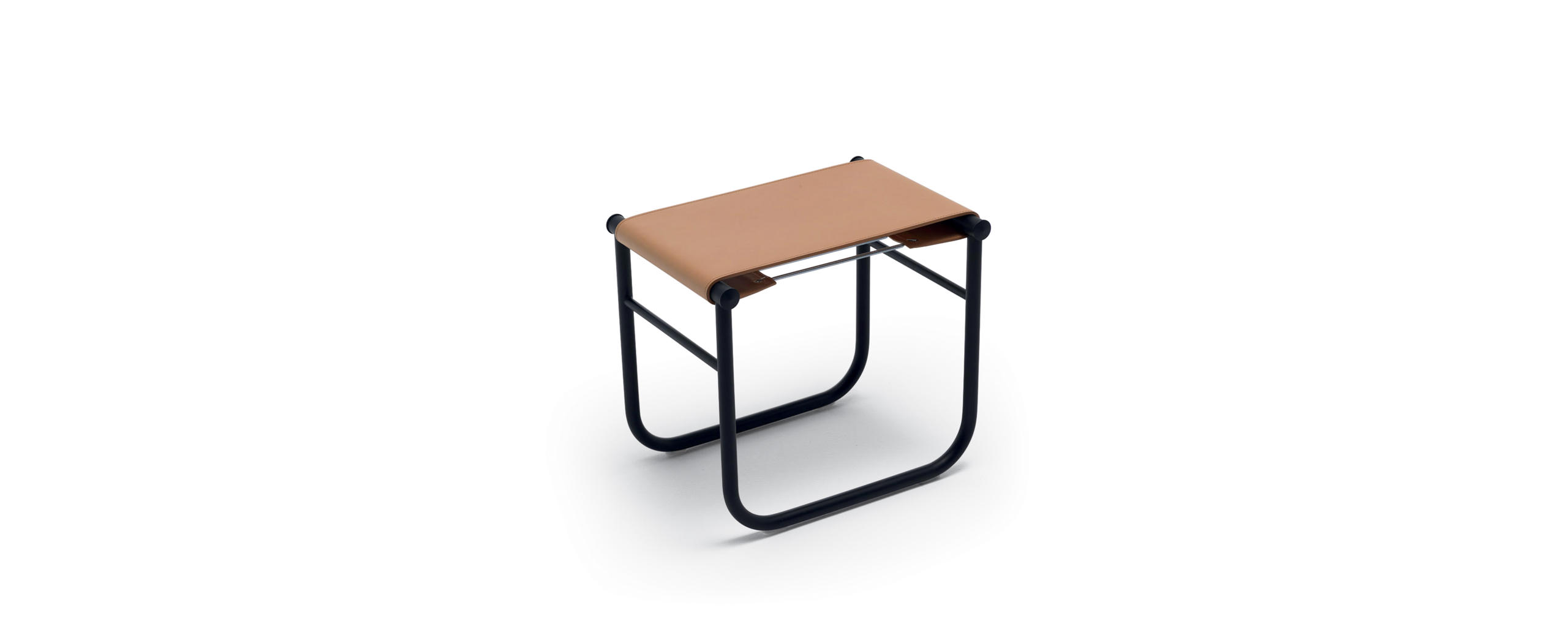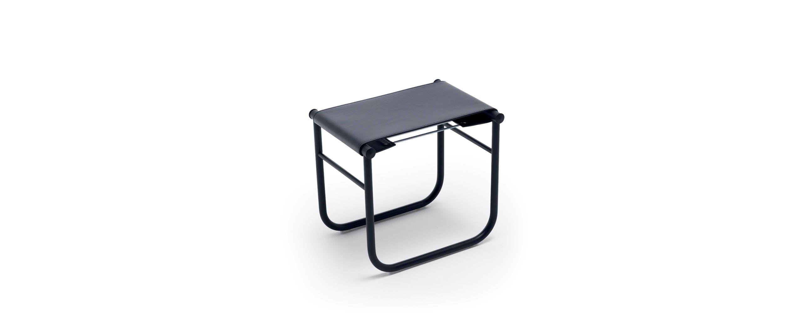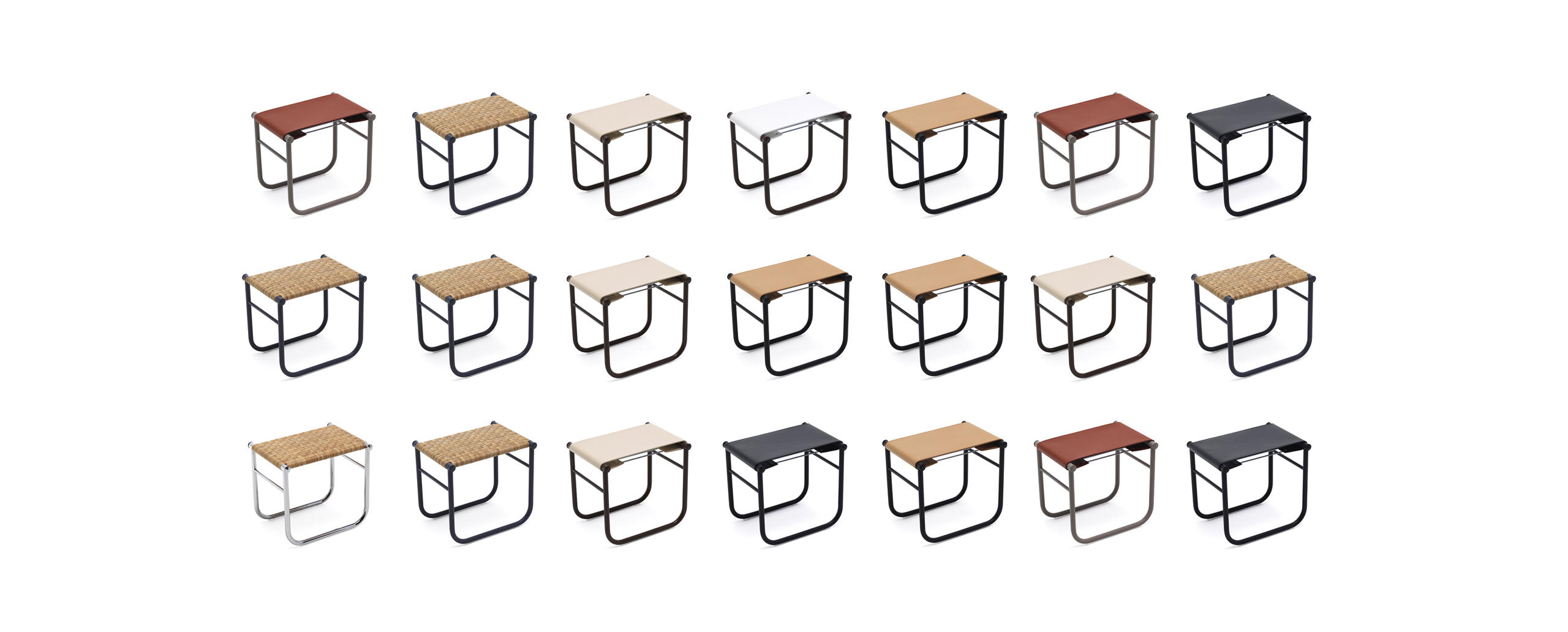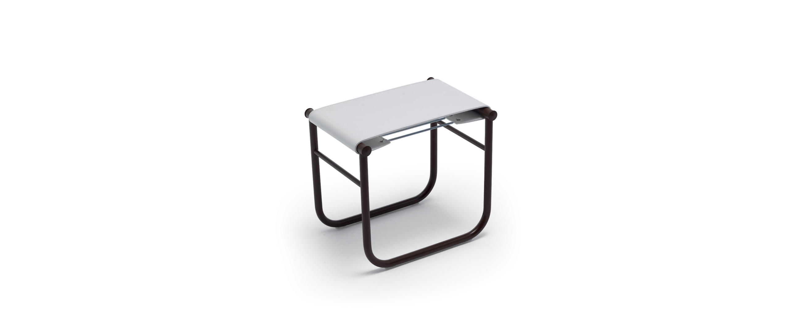 Uno sgabello con un volume architettonico che rispecchia perfettamente l’amore dell’autrice per l’armonia poetica. La prima versione fu studiata da Perriand nel 1927 per la sala da pranzo del suo appartamento parigino, realizzata con una struttura in tubolare metallico abbinata alla seduta in canna d’India intrecciata. Nel 1929 il progetto divenne parte dell’esposizione “équipement intérieur d’une Habitation” al Salon d’Automne, dove fu ambientato nella salle de bain in una versione con sedile in spugna più adatta allo spazio della cura personale. Il modello attuale è caratterizzato da una struttura in acciaio cromato trivalente, personalizzabile con diversi rivestimenti che includono la spugna, il cuoio e la classica canna d’India.