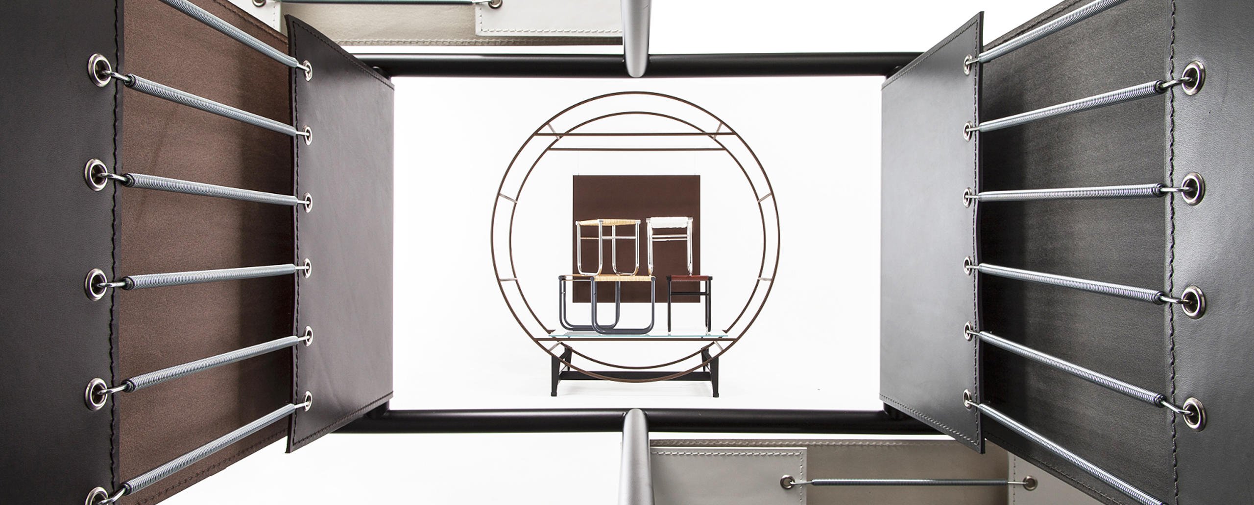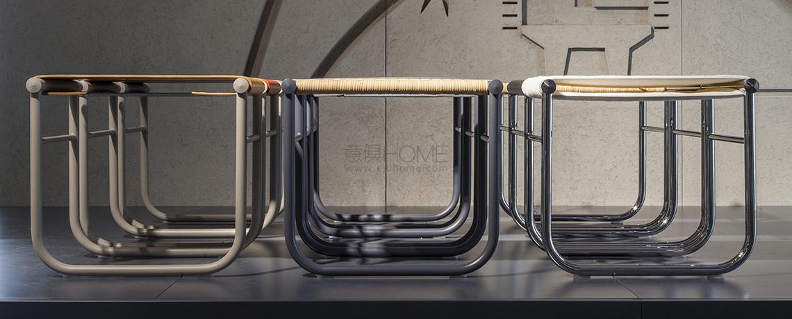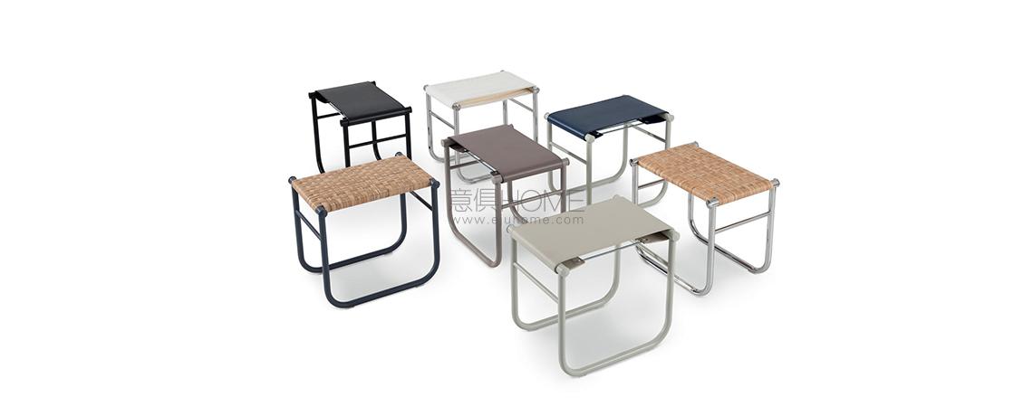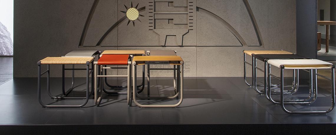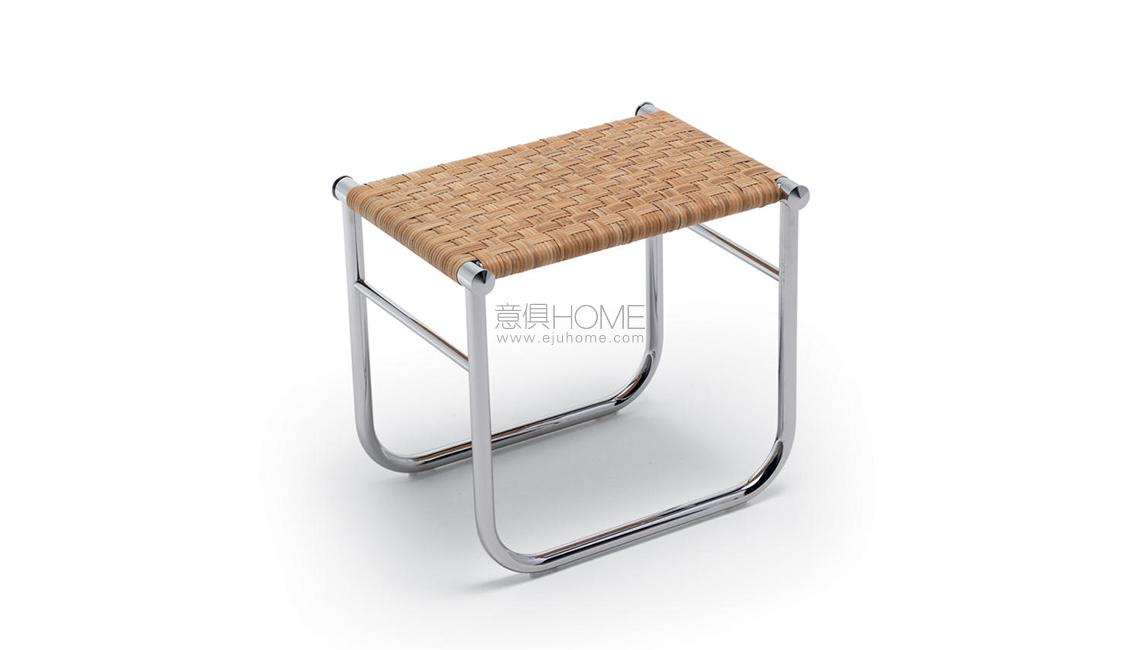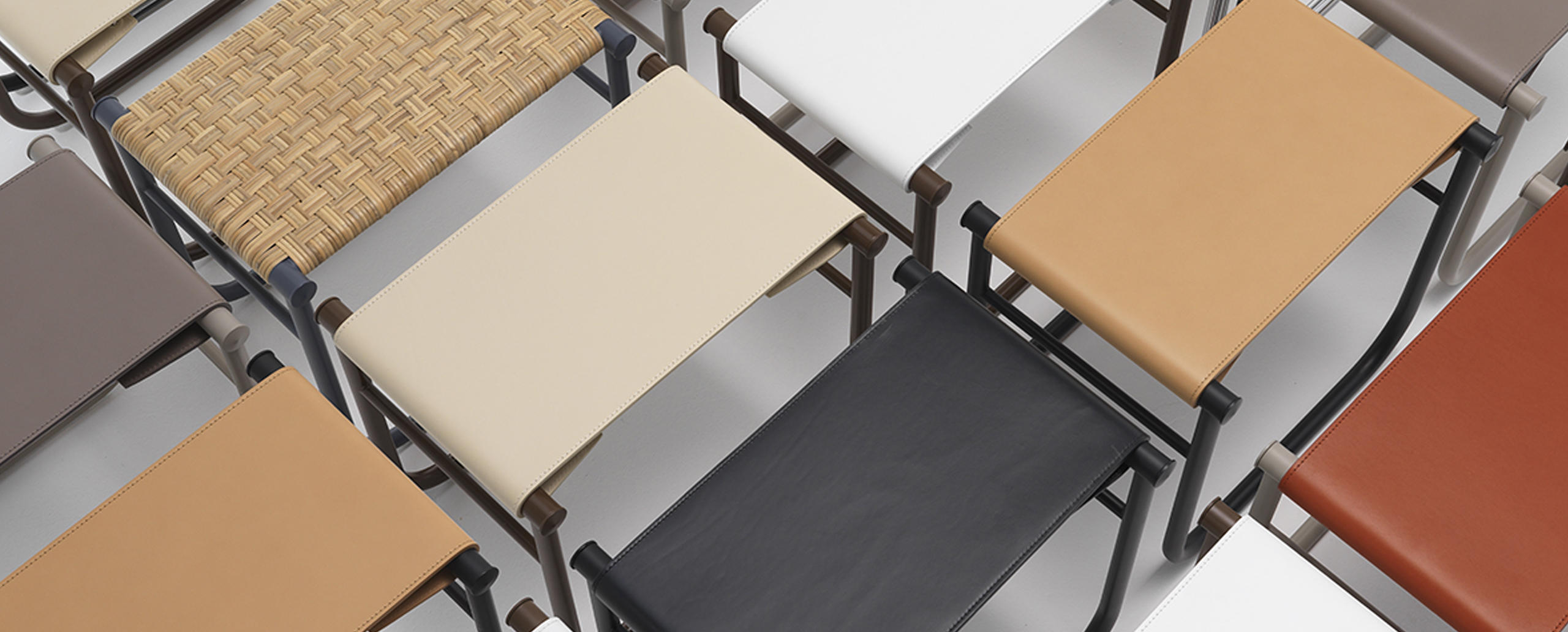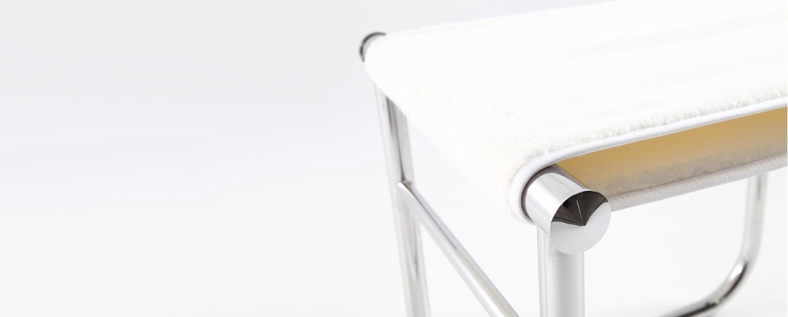 Uno sgabello con un volume architettonico che rispecchia perfettamente l’amore dell’autrice per l’armonia poetica. La prima versione fu studiata da Perriand nel 1927 per la sala da pranzo del suo appartamento parigino, realizzata con una struttura in tubolare metallico abbinata alla seduta in canna d’India intrecciata. Nel 1929 il progetto divenne parte dell’esposizione “équipement intérieur d’une Habitation” al Salon d’Automne, dove fu ambientato nella salle de bain in una versione con sedile in spugna più adatta allo spazio della cura personale. Il modello attuale è caratterizzato da una struttura in acciaio cromato trivalente, personalizzabile con diversi rivestimenti che includono la spugna, il cuoio e la classica canna d’India.