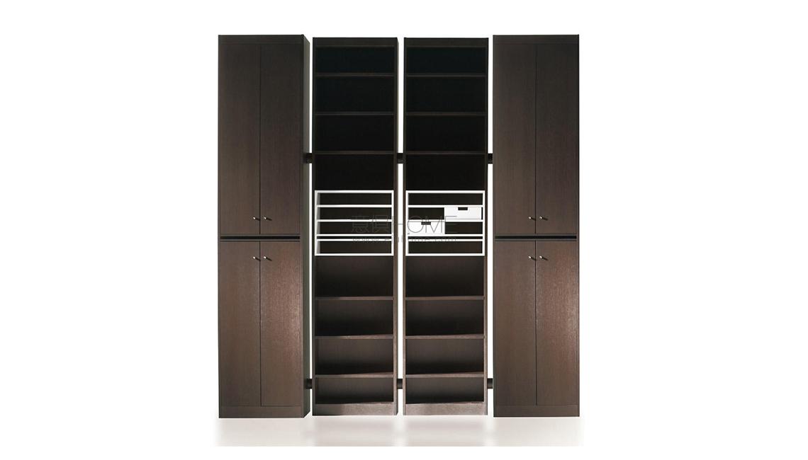 Questa libreria, realizzata negli anni’70  da Carlo Scarpa per la sua casa, fu in seguito ridisegnata su richiesta di Dino Gavina per essere compatibile con i processi della produzione industriale. Gli elementi componibili mediante un distanziatore, tratto iconico del progetto, sono disponibili con lavorazione impiallacciata in frassino naturale o tinto nero oppure interamente laccata opaca. Altrettanto distintivo è il blocco centrale costituito da ripiani o piccoli cassetti verniciati con finitura opaca.