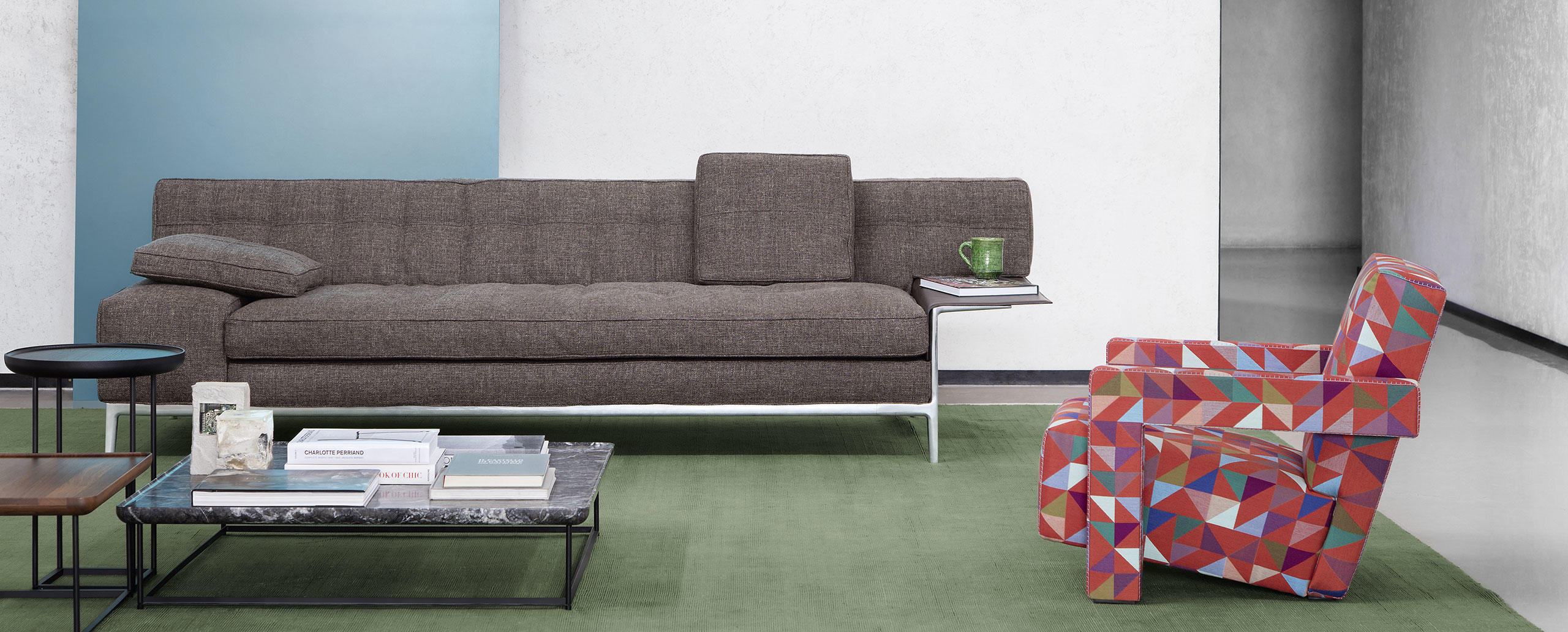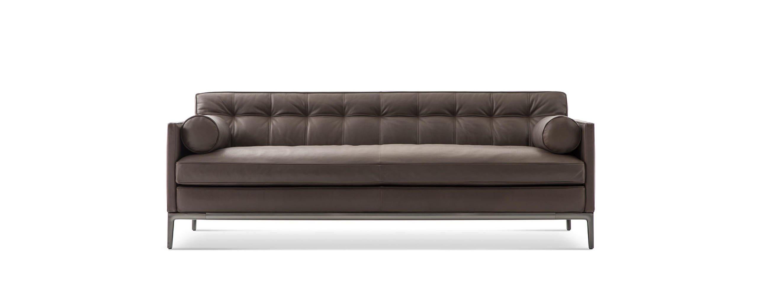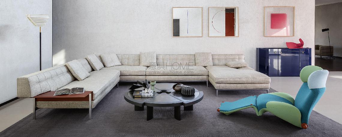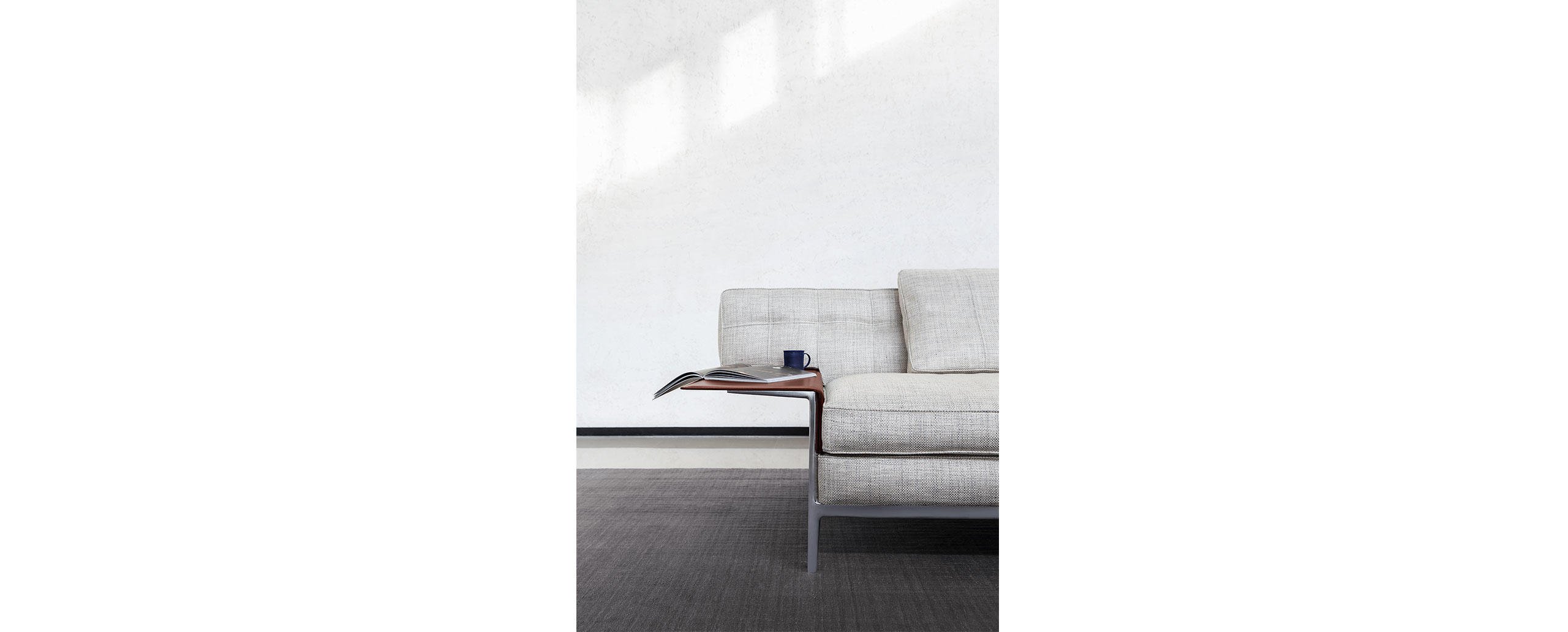 Divano componibile caratterizzato da un abaco completo e da un’estetica elegante e intramontabile, adattabile a tutte le tipologie di living. Il modello presenta l’innovativa lavorazione capitonné, un processo industriale sviluppato in esclusiva da Starck e Cassina, che in questo caso in alcune parti sostituisce il bottone tradizionale con un spunto di attacco nascosto all’interno. L’uniformità dell’imbottitura dello schienale deriva dall’utilizzo di un inserto in poliuretano preformato che accentua la sensazione extra-soft. La seduta presenta un cuscino unico e un bracciolo molto ampio, entrambi imbottiti in piuma con anima in poliuretano espanso. Le cuciture a vista sul perimetro e la lavorazione del cuoio che riveste i tavolini integrati esprimono l’estrema cura del dettaglio al cuore della maestria di Cassina. Volage EX-S offre molteplici composizioni, cui si aggiungono i nuovi tavolini coordinati e un nuovo modulo dell’abaco.