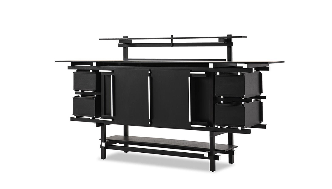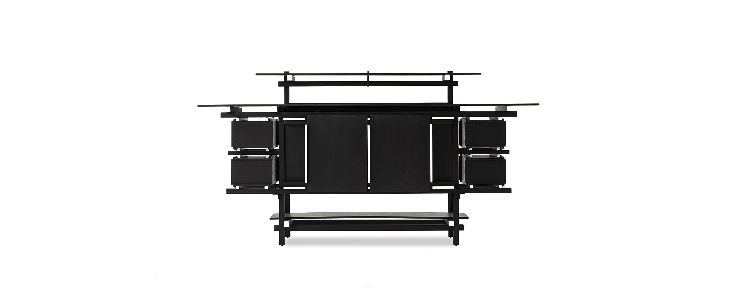 Rappresenta, con la Red and Blue, l’essenza della nuova spazialità del neoplasticismo. Riferimento fondamentale per l’affermazione del Moderno, questa credenza, progettata nel 1919, fu inizialmente utilizzata nell’alloggio modello progettato da J.P Oud per Spargen, Rotterdam e in vari progetti di interni, tra i quali quello per P.J Elling. Il modello originale andò distrutto in un incendio e fu ricostruito sotto la supervisione dell’autore nel 1951, per una mostra presso lo Stedelijk Museum ad Amsterdam. Oggi, per la prima volta, Cassina mette in produzione questo contenitore presso la sua storica falegnameria a Meda, in collaborazione con gli eredi. La purezza delle linee della struttura, dà origine a un reticolo fondato sul nodo strutturale, sul quale si innestano piani, cassetti e Contenitori e Librerie. Il modello risente dell’influenze di F.L.Wright e dall’arte anglo-giapponese di E.W.Godwin, soprattutto per l’orizzontalità accentuata dei piani, controbilanciata dai sostegni verticali a formare una gabbia a cui sono sospesi gli elementi di contenimento. La griglia di sostegno, virtualmente continua, ha le sezioni dei listelli a contrasto per esaltarne la forza dinamica verso l’esterno.